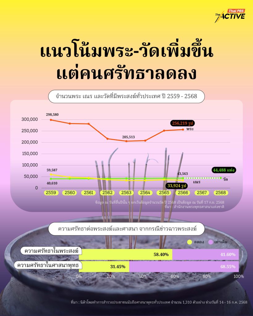 เมื่อเรามีวัดเพิ่มเกือบ 4,000 แห่งในรอบกว่า 10 ปี มีพระภิกษุ เพิ่มขึ้นกว่า 50,000 รูป ในรอบ 5 ปีมานี้ แต่ในขณะเดียวกัน ความศรัทธา ที่ประชาชนมีต่อพระสงฆ์กลับลดลงอย่างมีนัยสำคัญ ตอกย้ำจากผลสำรวจ นิด้าโพล ที่เผยว่า ร้อยละ 58.4 ของผู้ตอบแบบสอบถามจำนวน 1,310 ตัวอย่างรู้สึกว่า ศรัทธาต่อพระสงฆ์ลดลง ในขณะที่ร้อยละ 68.55 ของประชาชนตัวอย่าง ยังบอกว่า ศรัทธาในศาสนาพุทธเท่าเดิม หรือนี้กำลังเป็นนัยที่บอกว่า ศาสนาพุทธอาจกำลังเผชิญ ภาวะศรัทธาถดถอย ในระดับปัจเจกบุคคลจริง ๆ