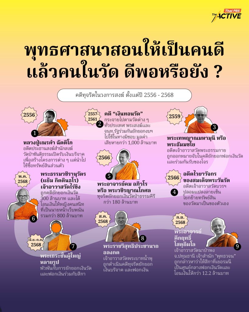 เมื่อผลโพลย้ำชัดถึงระดับตัวบุคคล ที่มีผลต่อวิกฤตศรัทธา เราลองมาดูกันต่อว่า อะไรทำให้ผู้คนศรัทธาต่อพระภิกษุลดลง เพราะหากไล่ย้อนดูข้อมูล ตลอดปี 2568 พบข่าวคราวการทุจริตคอร์รัปชันภายในแวดวงพระสงฆ์อย่างต่อเนื่อง หลายกรณีเริ่มเข้าสู่กระบวนการตรวจสอบ ลงโทษ เอาผิดในทางคดีกับผู้ที่เกี่ยวข้อง และทั้งหมดล้วนมีจุดเริ่มต้นมากจากพระสงฆ์นั่นเอง