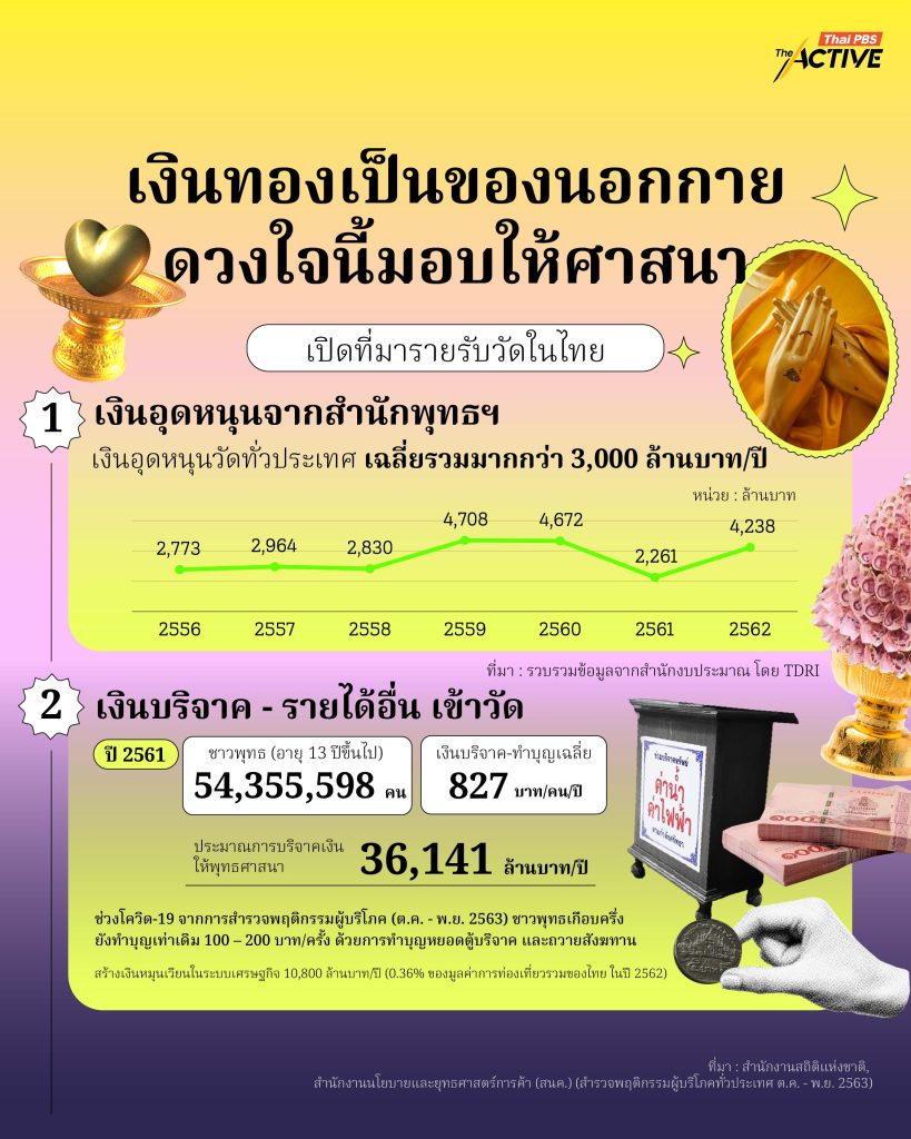 สำนักงานสถิติแห่งชาติ กระทรวงดิจิทัลเพื่อเศรษฐกิจและสังคม ระบุว่าในปี 2561 พบว่า ชาวพุทธ (อายุ 13 ปีขึ้นไป) รวม 54,355,598 คน บริจาคเงินโดยเฉลี่ย 827 บาท/คน/ปี ประมาณการบริจาคเงินให้พุทธศาสนาราว ๆ 36,141 ล้านบาท/ปี