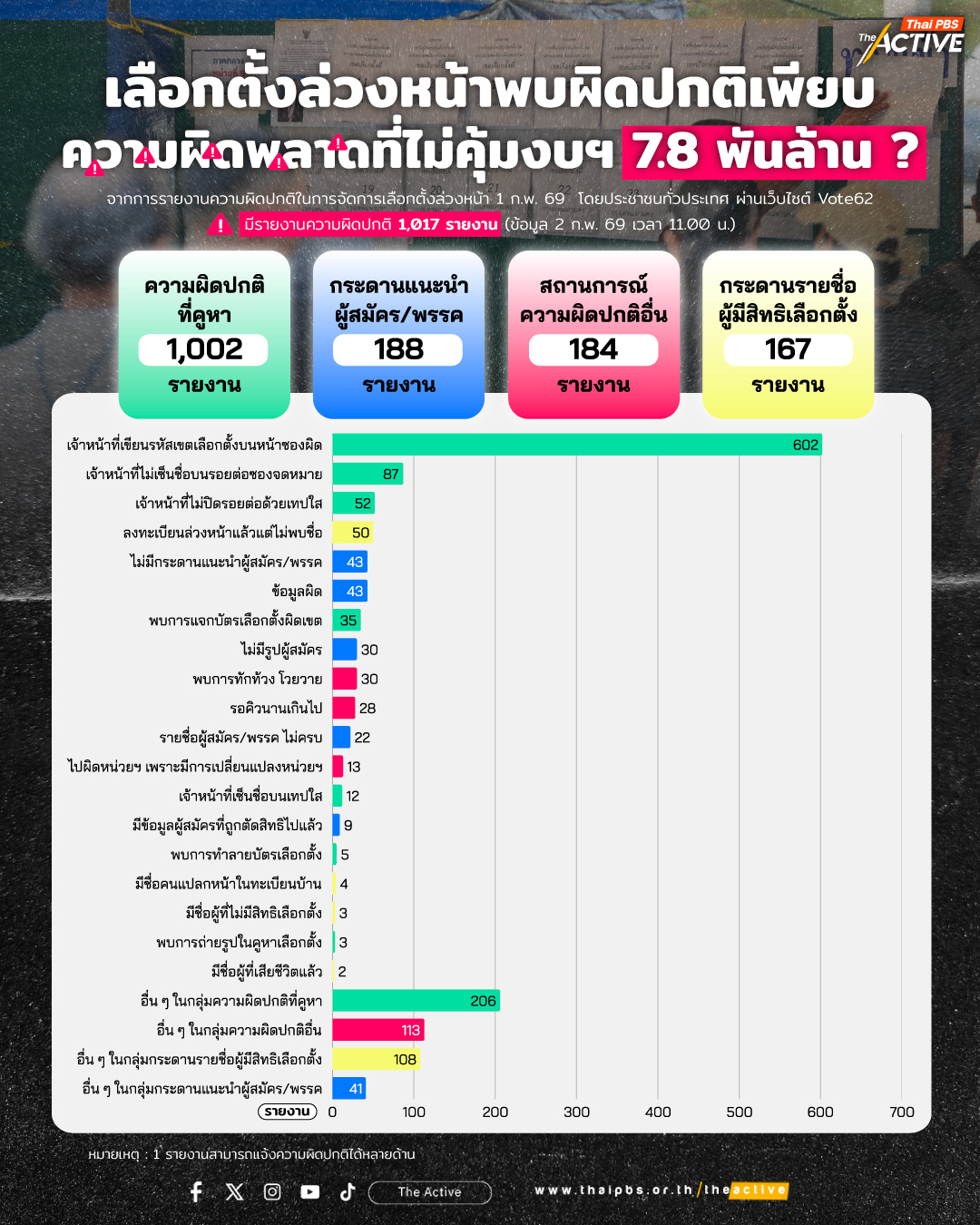 การเขียนรหัสผิดเกิดขึ้นในหลายพื้นที่ สอดคล้องกับการรายงานความผิดปกติในการเลือกตั้งล่วงหน้าโดยประชาชน ผ่านเว็บไซต์ Vote62 โดยข้อมูลวันที่ 2 ก.พ. 69 เวลา 11.00 น. พบว่าการเขียนรหัสเขตเลือกตั้งบนซองผิด เป็นความผิดปกติที่ถูกรายงานมากที่สุดถึง 602 รายงาน จากทั้งหมด 1,017 รายงาน