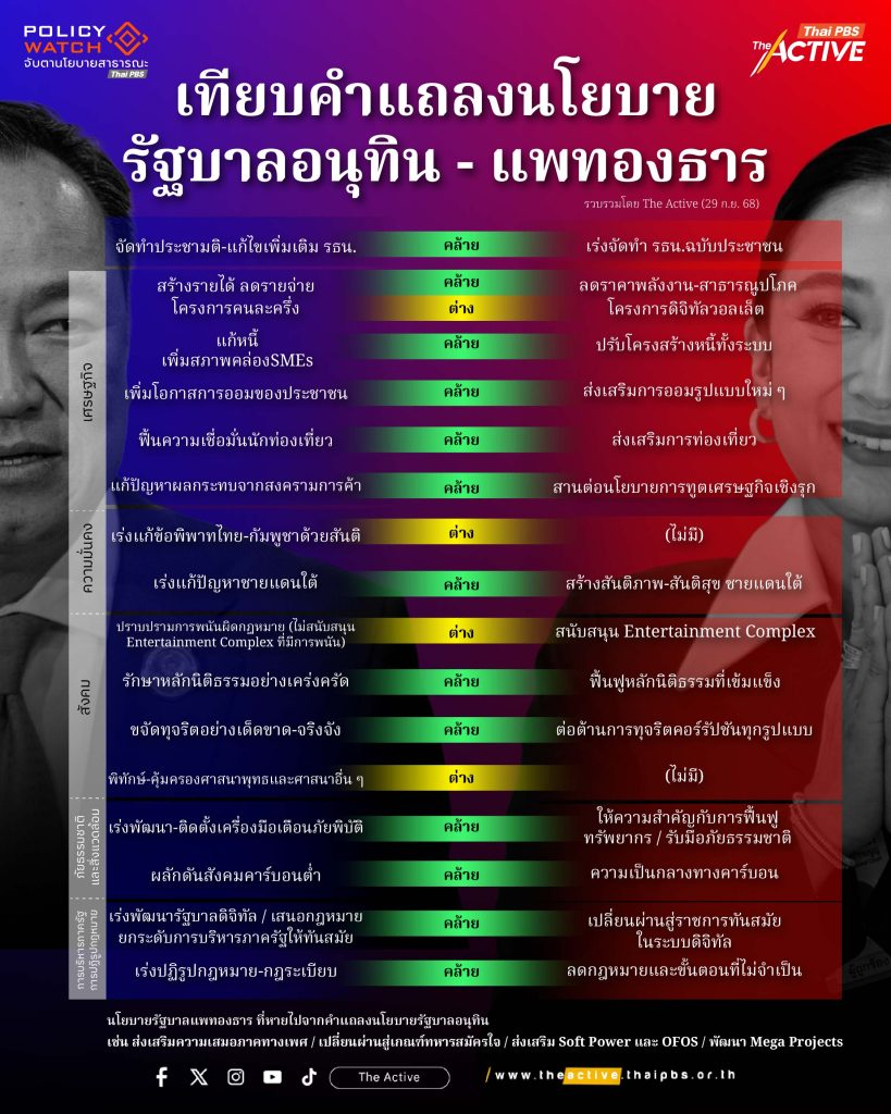 คำแถลงนโยบายอนุทิน | คำแถลงนโยบายแพทองธาร |