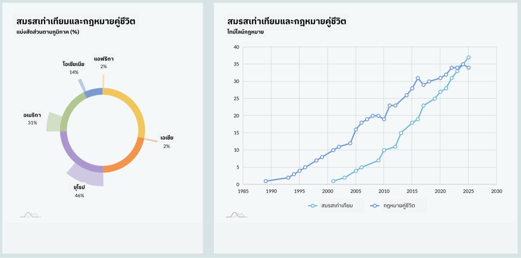 แต่ด้วยปัจจัยสถานการณ์ในปัจจุบัน ท่ามกลางกระแสถดถอยทั่วโลก ประเทศไทยกลับโดดเด่นในฐานะ ข้อยกเว้น ที่สำคัญ กฎหมายสมรสเท่าเทียมที่มีผลบังคับใช้ตั้งแต่ต้นปี 2025 ถือเป็นชัยชนะครั้งสำคัญระดับโลก