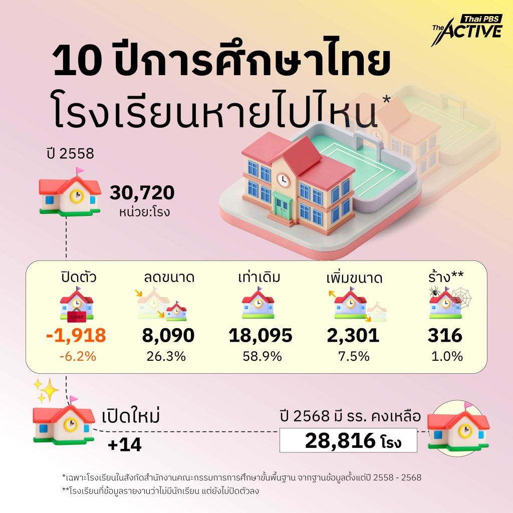 สำนักงานคณะกรรมการการศึกษาขั้นพื้นฐาน (สพฐ.) ซึ่งมีโรงเรียนตั้งแต่ระดับอนุบาลถึงมัธยมศึกษาตอนปลาย พบว่าจำนวนนักเรียนสังกัด สพฐ. ลดลงประมาณ 10% ในช่วง 10 ปีที่ผ่านมา จากประมาณ 7 ล้านคน เหลือราว 6.2 ล้านคน โรงเรียนที่เคยมีประมาณ 30,000 แห่ง ลดลงเหลือราว 28,000 แห่ง แนวโน้มการลดลงนี้ส่งผลกระทบหนักที่สุดกับโรงเรียนขนาดกลางและขนาดเล็ก โรงเรียนราว ๆ 1 ใน 4 หดขนาดจากใหญ่เป็นกลาง หรือจากกลางเป็นเล็ก ขณะที่มีเพียง 7.5% เท่านั้นที่มีจำนวนนักเรียนเพิ่มขึ้น และที่น่ากังวลมากที่สุดคือ ในบรรดาโรงเรียนหายไปจากฐานข้อมูลอย่างน้อย 1,918 โรง เป็นโรงเรียนขนาดเล็กถึง 99%