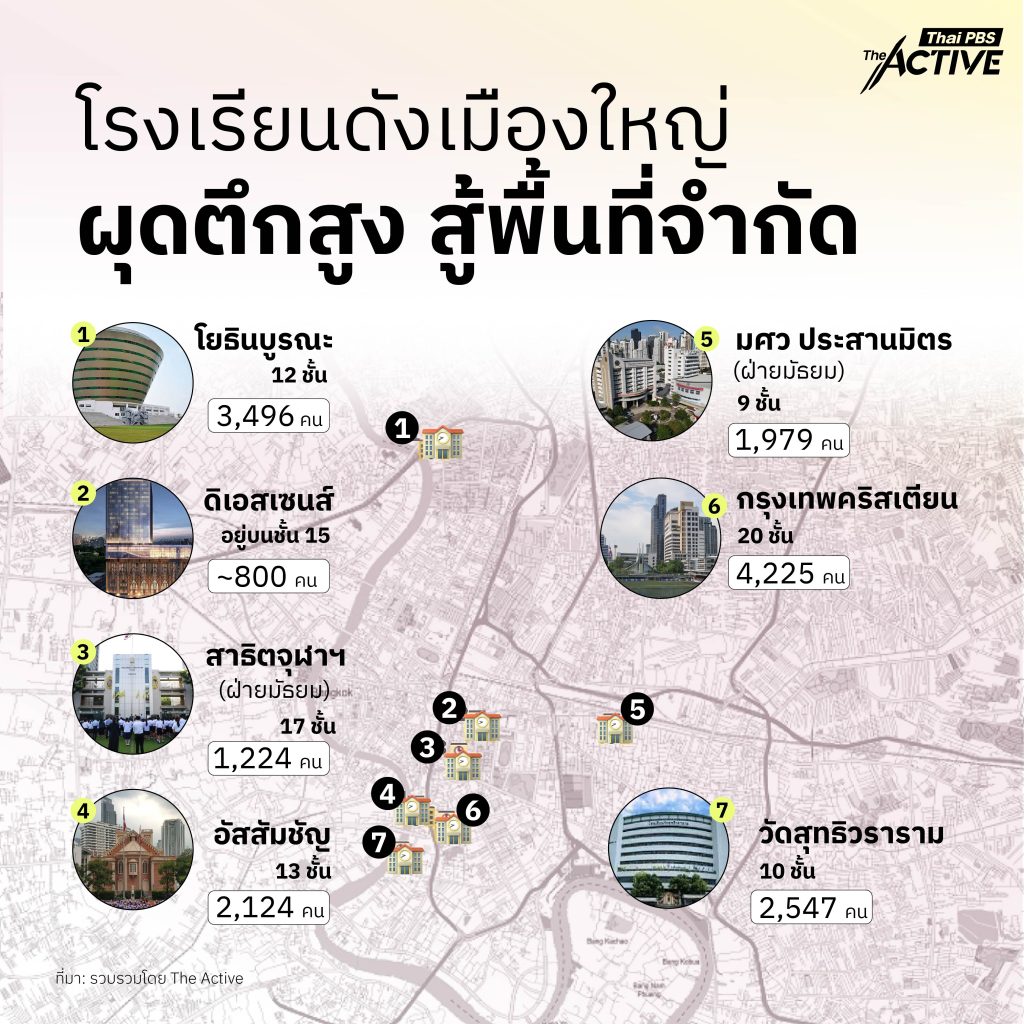ขณะที่หลายโรงเรียนดังในกรุงเทพมหานคร มีแนวโน้มการแข่งขันเพื่อเข้าเรียนที่สูงมากขึ้นเรื่อย ๆ ตามปัจจัยค่านิยมของผู้ปกครองที่จะส่งบุตรหลานเข้าเรียนในสถานศึกษาที่มีคุณภาพหรือมีชื่อเสียงมากกว่าการส่งลูกเรียนโรงเรียนใกล้บ้าน ทำให้เรามักพบเห็นตึกอาคารเรียนเพื่อขยายพื้นที่การเรียนรู้ให้เพียงพอต่อจำนวนนักเรียน ให้การใช้สอยพื้นที่เกิดอรรถประโยชน์สูงสุดดังตัวอย่างสถานศึกษาในแผนภาพกราฟิกด้านล่างนี้