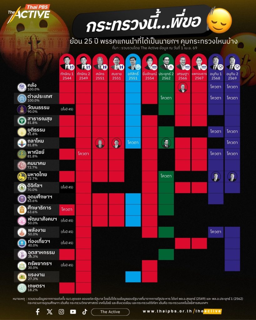 ในโอกาสที่ได้ ครม.ใหม่ นี้ The Active ชวนพูดคุยกับ รศ.ยุทธพร อิสรชัย รองศาสตราจารย์ประจำสาขาวิชารัฐศาสตร์ มหาวิทยาลัยสุโขทัยธรรมาธิราช และย้อนดูข้อมูล 25 ปี บนเส้นทางประวัติศาสตร์การเมืองไทย ตั้งแต่ ครม. สมัยนายกฯ ทักษิณ 1 เรื่อยมาถึงนายกฯ อนุทิน 2 ผ่าน ครม. กว่า 12 ชุด ว่าพรรคแกนนำที่ได้เป็นนายกฯ มักจะเลือกเข้าไปกำกับดูแลกระทรวงอะไรบ้าง และปล่อยให้พรรคร่วมรัฐบาลอื่น ๆ ดูกระทรวงไหนกันบ้าง
