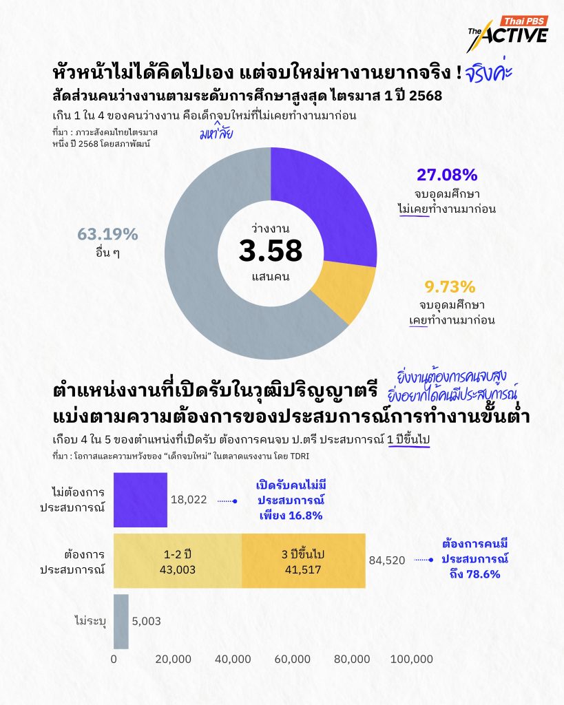 ตัวเลขจากสภาพัฒน์ ยืนยันปัญหานี้ได้ดี โดยผลการศึกษา พบว่า 1 ใน 4 ของคนที่ ว่างงาน คือ เด็กมหาวิทยาลัยจบใหม่ที่ยังไม่เคยทำงาน รวมเป็น 97,000 คน มากกว่าผู้จบมหาวิทยาลัยที่เคยทำงานแล้วถึง 3 เท่า