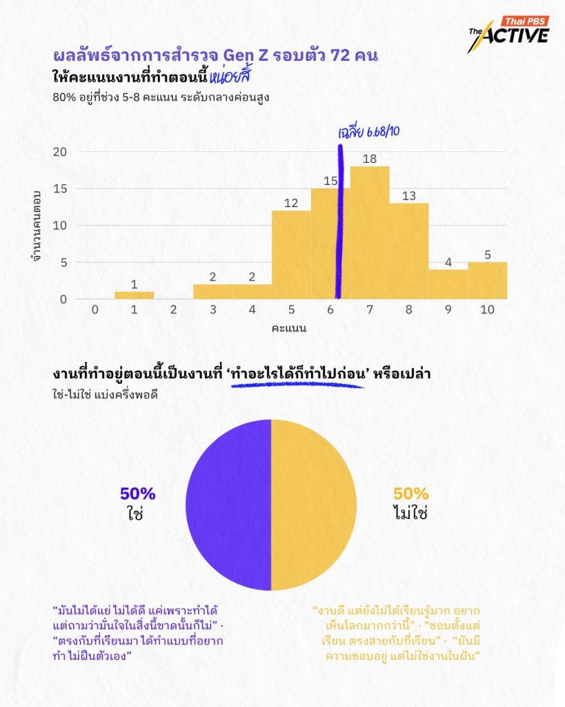 เราลองสำรวจเหล่า Gen Z ช่วงวัย 20-28 ปี ที่เริ่มทำงานแล้ว 72 คนรอบตัว พบว่า พวกเขาให้คะแนนงานที่ทำอยู่เฉลี่ย 6.68 เต็ม 10 คะแนน ซึ่งใกล้เคียงกับคะแนน 7 ของ ธี และสอดคล้องกับผลสำรวจความพึงพอใจอาชีพในทุกช่วงวัยของ PwC เมื่อปี 2024 ที่มีสัดส่วนพึงพอใจ 65%