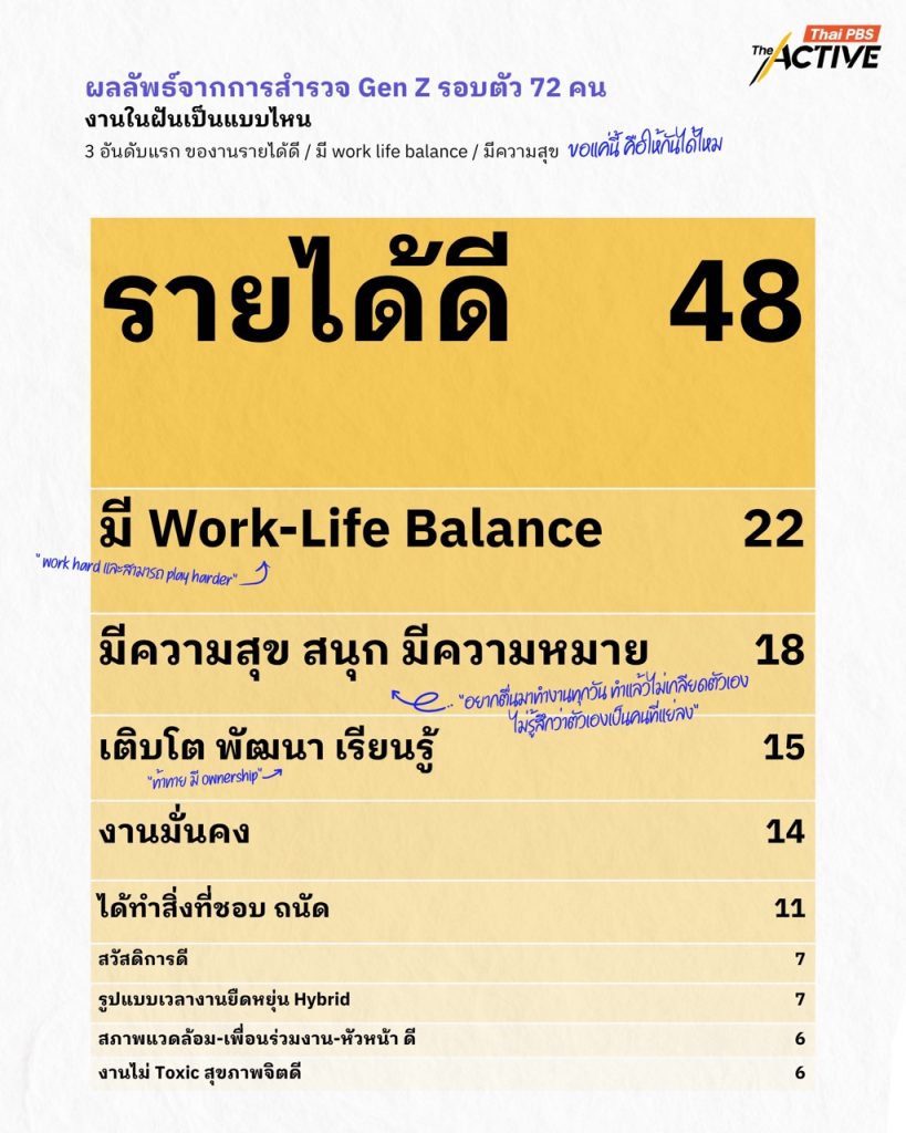 การสำรวจ Jobs_that_makesense Asia พบว่า คนไทยทั่วไปต้องการทำงานที่มีความหมายถึง 96% ส่วนคุณสมบัติงานที่พวกเขาต้องการมีเรื่องเงิน ความมั่นคง และชีวิตส่วนตัวด้วย