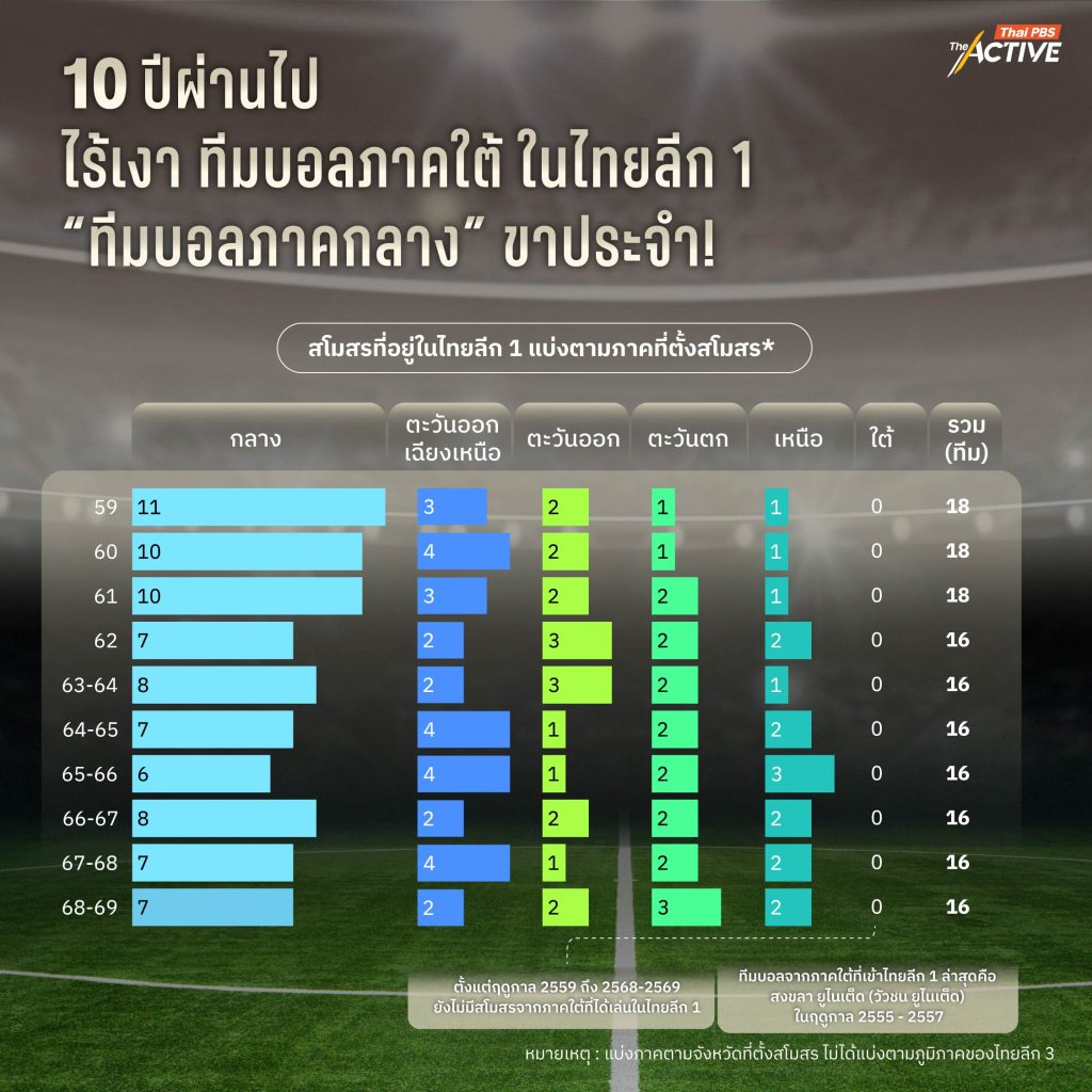 ถ้าลองเจาะลึกลงมาในช่วง 10 ปีมานี้ จะพบข้อมูลที่น่าสนใจ เพราะพื้นที่ลีกสูงสุดของไทยซึ่งมีทีมแข่งขัน 18 ทีมต่อฤดูกาล ในฤดูกาล 2559 ถึง 2561 และ 16 ทีมต่อฤดูกาล ในฤดูกาล 2562 ถึง 2568-69 พบว่า ทีมขาประจำส่วนใหญ่ที่โชว์แข้งในลีกสูงสุดมากที่สุด คือ ทีมจากภาคกลาง ตั้งแต่ 6 – 11 ทีมต่อฤดูกาล คิดเป็นสัดส่วน 37.5 – 61.1% ของทีมทั้งหมดในแต่ละฤดูกาล