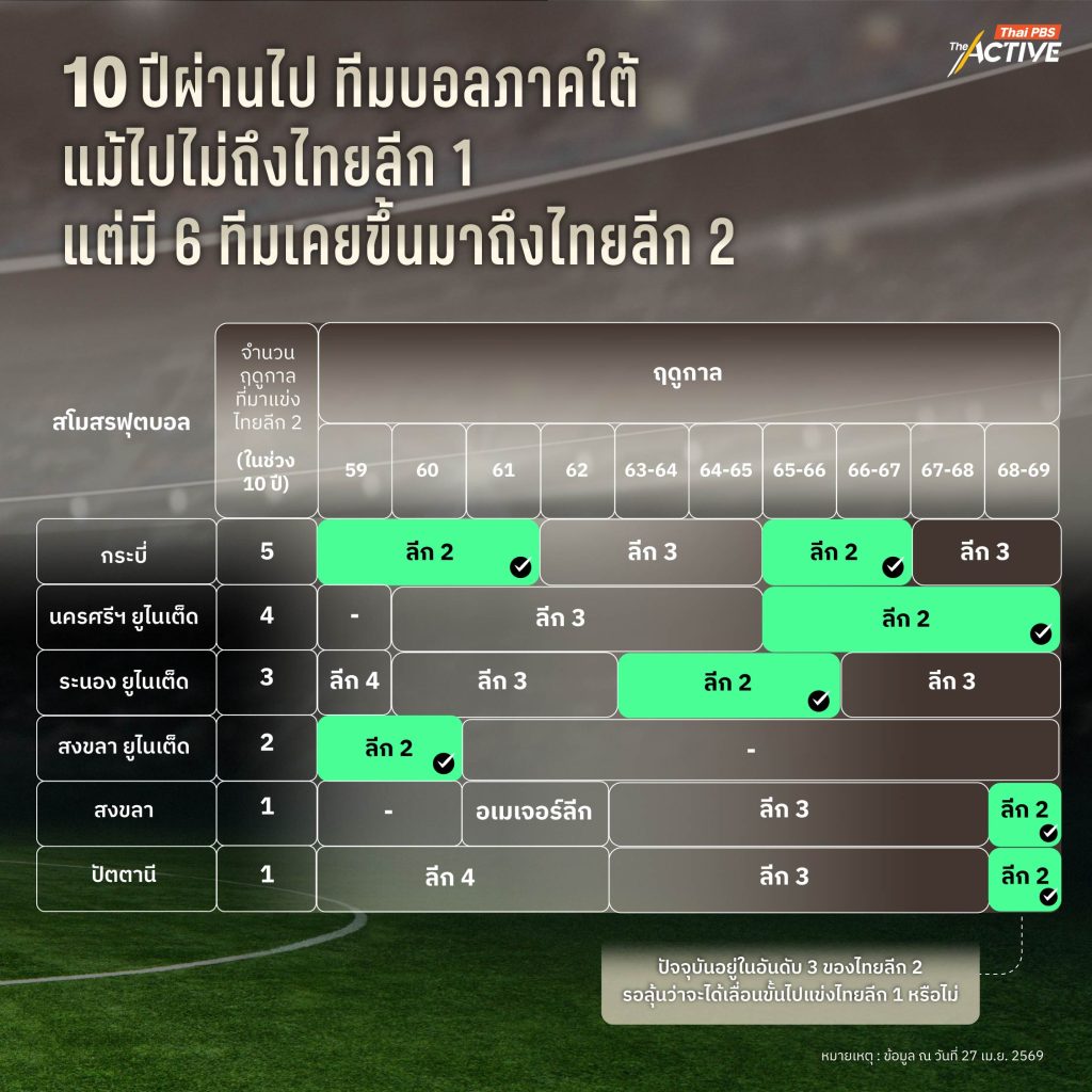 ในขณะที่ทีมจากภาคใต้ ไม่เคยก้าวเข้ามาเล่นในพื้นที่ลีกสูงสุด อย่าง ไทยลีก 1 ได้เลยในรอบ 10 ปีที่ผ่านมา