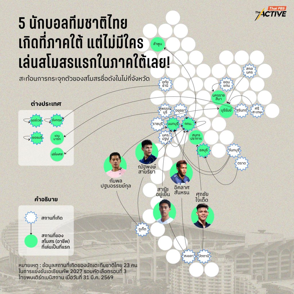 The Active รวบรวมข้อมูลนักบอลทีมชาติไทย ในการแข่งขันเอเชียนคัพ 2027 รอบคัดเลือกรอบที่ 3 ที่ไทยพบเติร์กเมนิสถาน เมื่อวันที่ 31 มี.ค. 2569 พบว่า จากนักบอลทีมชาติ 23 คน มีนักบอล 5 คนที่เกิดที่จังหวัดในภาคใต้ ได้แก่