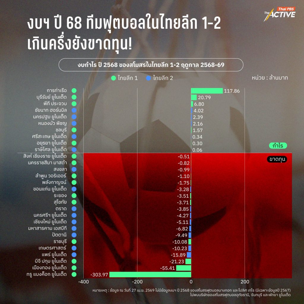 เพราะการสร้างผู้เล่นระดับสูง ต้องอาศัยรากฐานสำคัญ คือ สโมสรที่มั่นคง ทั้งงบประมาณ บุคลากร และการลงทุนระยะยาว แต่เมื่อย้อนดูข้อมูลการเงินของหลายสโมสรในไทยลีก กลับพบว่า ปัญหาขาดทุน ยังเกิดขึ้นเป็นวงกว้าง