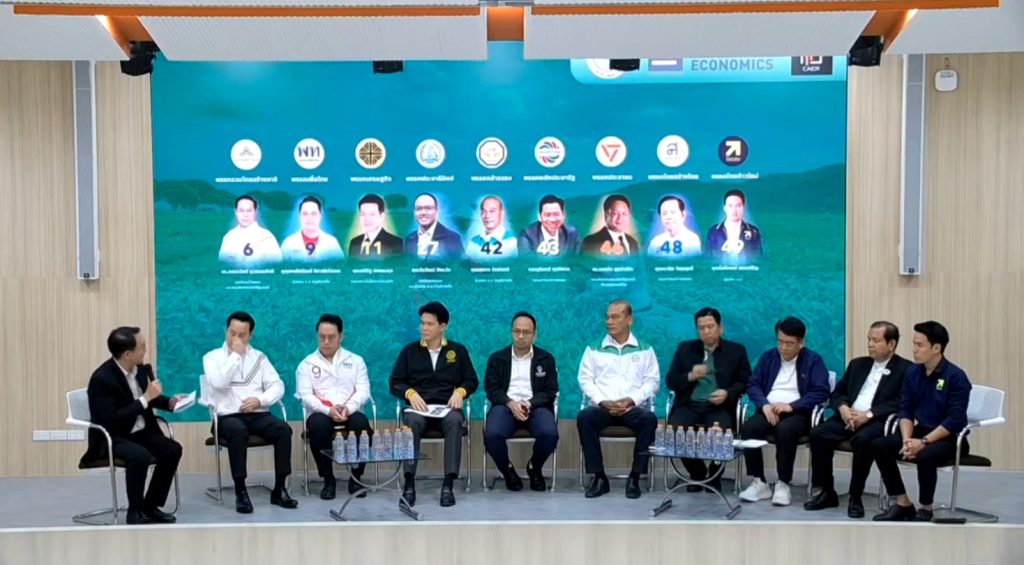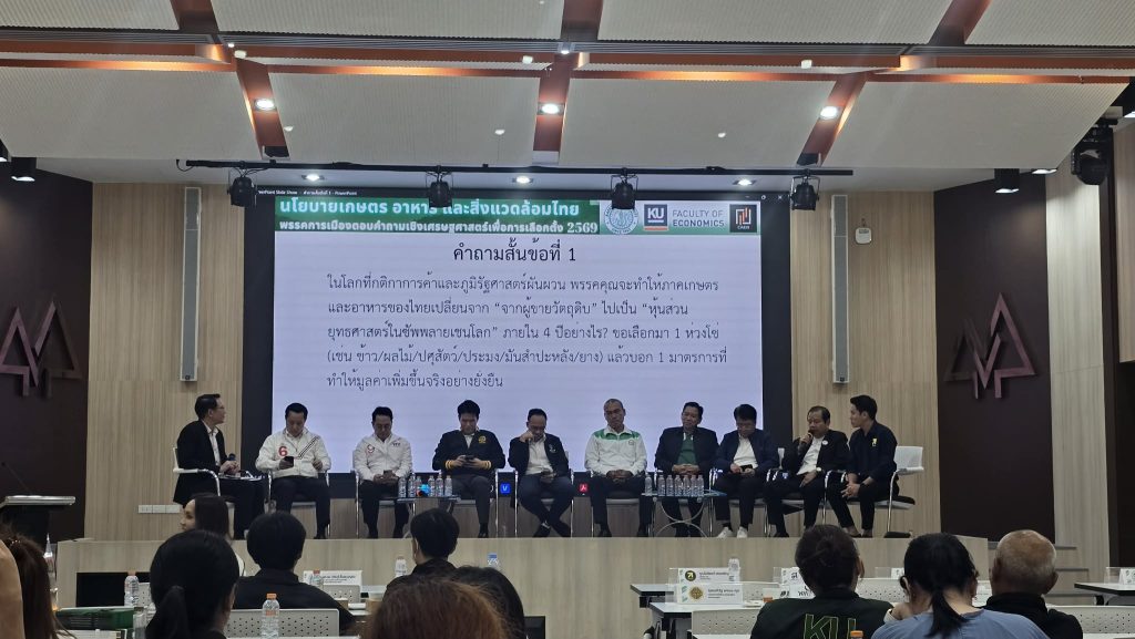 ขณะที่เวทีเสวนาวิชาการ หัวข้อ “นโยบายเกษตร อาหาร และสิ่งแวดล้อมไทย พรรคการเมืองตอบคำถามเพื่อการเลือกตั้ง 2569 ภายใต้ข้อจำกัดทางงบประมาณและความเป็นไปได้เชิงนโยบาย” ซึ่งจัดโดยศูนย์วิจัยเศรษฐศาสตร์ประยุกต์ มีผู้แทนจาก 9 พรรคการเมืองเข้าร่วม ได้แก่ พรรคกล้าธรรม, พรรคไทยก้าวใหม่, พรรคไทยสร้างไทย, พรรคประชาชน, พรรคประชาธิปัตย์, พรรคพลังประชารัฐ, พรรคเพื่อไทย, พรรครวมไทยสร้างชาติ และพรรคเศรษฐกิจ