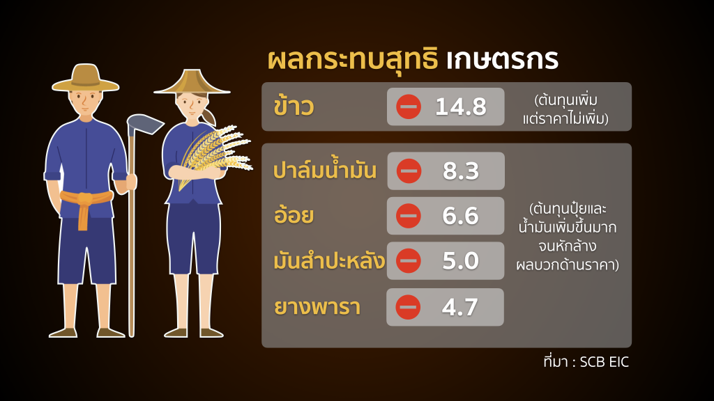 ภาพที่น่ากังวลที่สุดตกไปอยู่ที่ “ข้าว” ซึ่งเป็นกลุ่มเดียวที่ผลกระทบสุทธิติดลบสูงถึง 14.8% และเป็นอุตสาหกรรมเดียวที่ทั้งชาวนาและโรงสีมีแนวโน้มได้รับผลกระทบเป็นลบอย่างหนัก