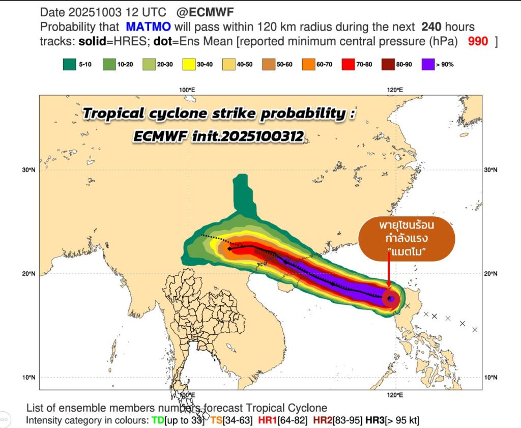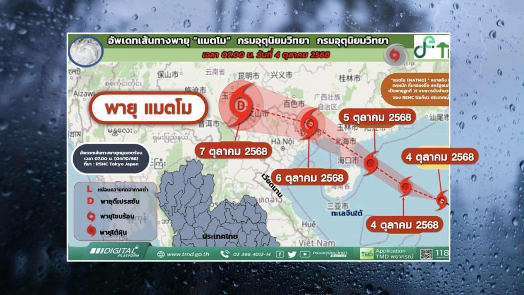 วันนี้ 4 ต.ค. 68 พายุโซนร้อนกำลังแรง ”แมตโม” ที่ขณะนี้อยู่ในบริเวณทะเลจีนใต้ กำลังเคลื่อนตัวไปทางเกาะไหลหลำ และคาดว่าจะขึ้นฝั่งที่ประเทศจีนตอนใต้ หรือแนวประเทศเวียดนามตอนบน ช่วงวันที่ 5-6 ต.ค.68 และ มีแนวโน้มจะแรงขึ้นเป็นพายุไต้ฝุ่นได้