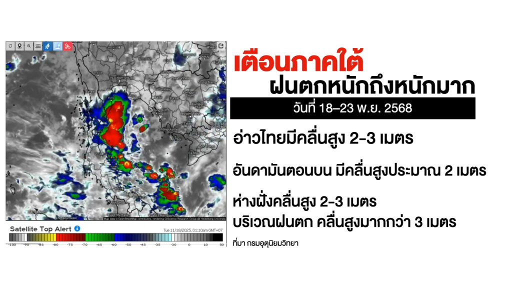 จากการคาดการณ์พื้นที่เสี่ยงฝนตกหนักล่วงหน้า 3 วัน (ช่วงวันที่ 18-20 พ.ย. 68) พบว่า ในบางพื้นที่ของ จ.ชุมพร, สุราษฎร์ธานี, นครศรีธรรมราช, พัทลุง, สงขลา, สตูล, ยะลา และนราธิวาส จะมีปริมาณฝนสะสมมากกว่า 200 มม.
