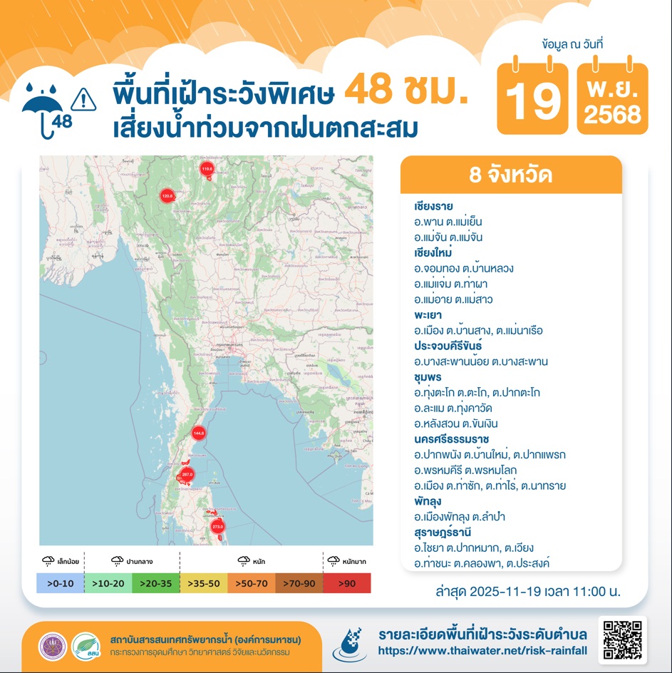 สถาบันสารสนเทศทรัพยากรน้ำ (องค์การมหาชน) เตือน พื้นที่เฝ้าระวัง 48 ชั่วโมง เสี่ยงน้ำท่วมจากฝนสะสม มี 8 จังหวัด 16 อำเภอ เช่น จังหวัดเชียงราย, เชียงใหม่, พะเยา, ประจวบคีรีขันธ์, ชุมพร, นครศรีธรรมราช, พัทลุง, สุราษฎร์ธานี