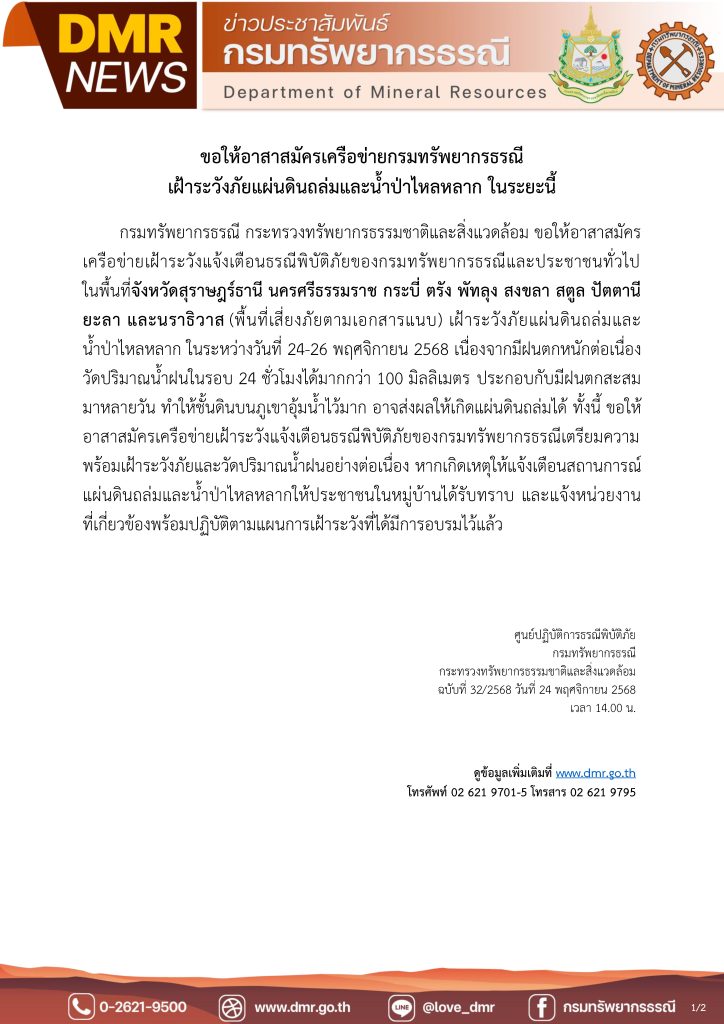 ขณะที่ กรมทรัพยากรธรณี กระทรวงทรัพยากรธรรมชาติและสิ่งแวดล้อม ประกาศขอให้อาสาสมัครเครือข่ายในพื้นที่จังหวัดสุราษฎร์ธานี นครศรีธรรมราช กระบี่ ตรัง พัทลุง สงขลา สตูล ปัตตานี ยะลา และนราธิวาส เฝ้าระวังภัยแผ่นดินถล่มและน้ำป่าไหลหลาก ในระหว่างวันที่ 24-26 พฤศจิกายน 2568 และขอให้เครือข่ายฯ ทธ. วัดปริมาณน้ำฝนอย่างต่อเนื่อง ทั้งนี้ ศูนย์ปฏิบัติการธรณีพิบัติภัย จะติดตามสถานการณ์อย่างใกล้ชิด โดยมีข้อแนะนำ ดังนี้