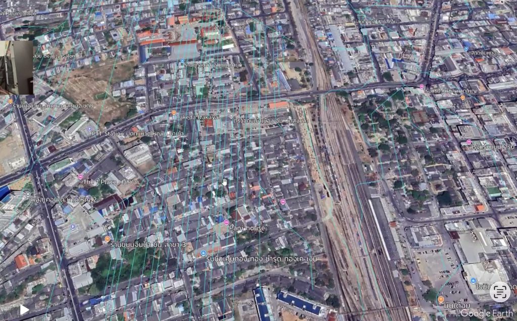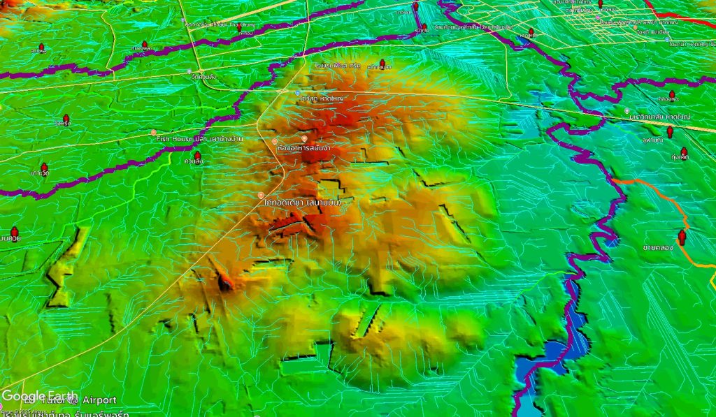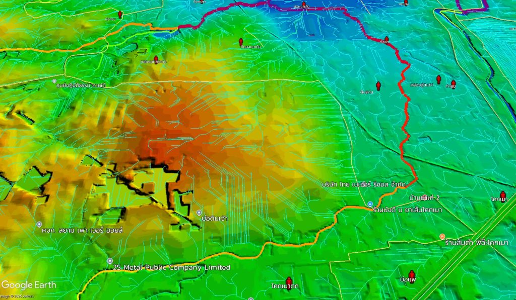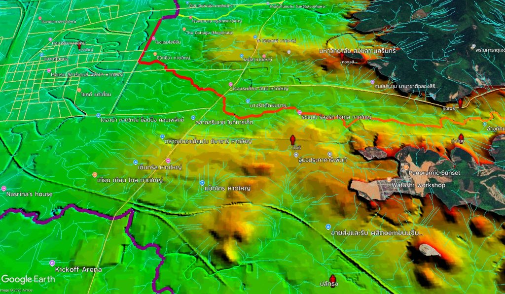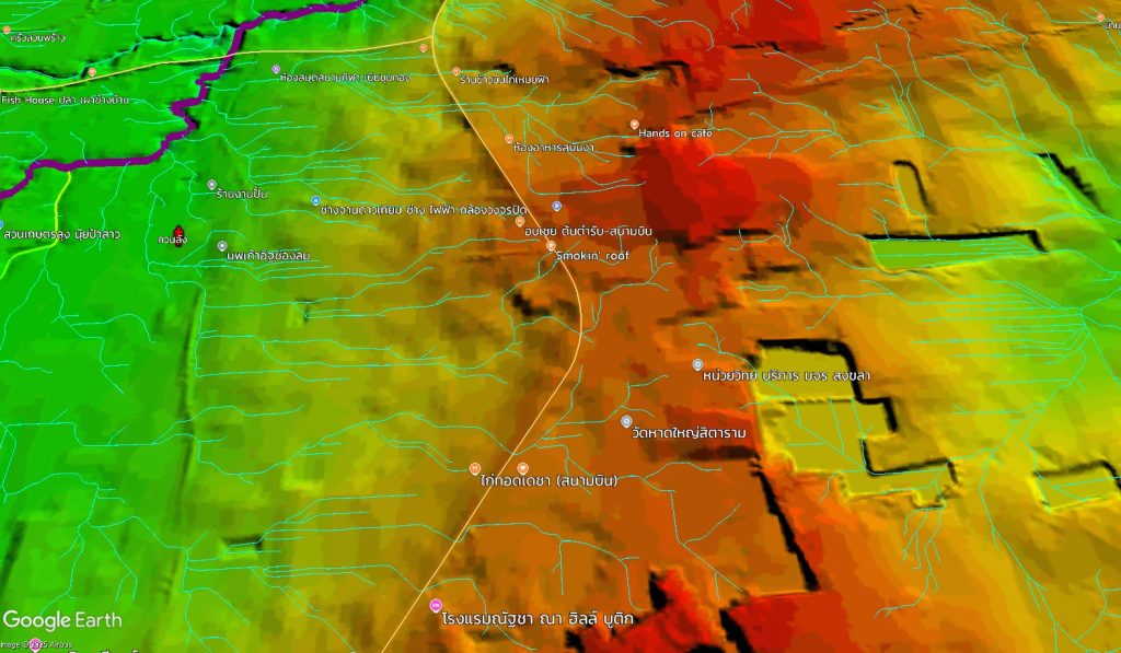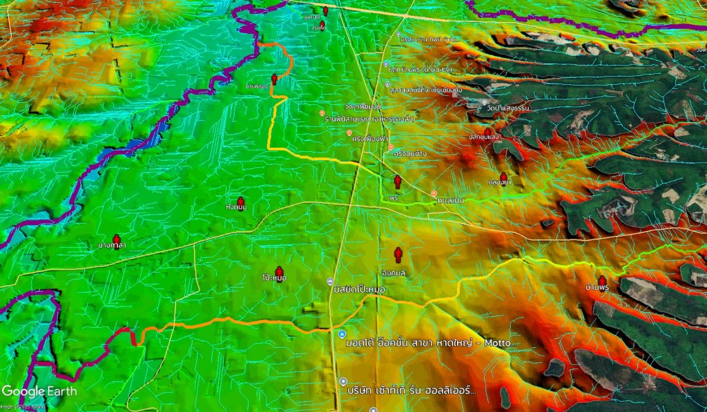 ศ.สันติ ชี้ว่า จุดที่น่ากังวลที่สุด คือ พื้นที่ราบระหว่าง คลองอู่ตะเภา กับ ทางรถไฟ เพราะเมื่อน้ำล้นตลิ่งมา ประกอบกับมีทางรถไฟกั้นอยู่ ทำให้บริเวณนั้นเปรียบเสมือน “อ่างเก็บน้ำ” และการเข้าช่วยเหลือจำเป็นต้องดูเส้นทางการเข้าไปอย่างปลอดภัย โดยทางมิตรเอิร์ธจะทำข้อมูลภูมิประเทศไว้ ว่าจุดไหนที่เข้าไปแล้วปลอดภัย และจากการทำข้อมูล (ในภาพ) จะเห็นว่าเส้นสีฟ้าที่เป็นเส้นตรงถี่ ๆ นั้นถือว่าอันตรายมาก เพราะทั้งราบ เรียบ ลุ่มต่ำ ซึ่งน่ากลัวมากเพราะน้ำจะท่วมขังได้ ซึ่งเป็นพื้นที่เหมาะกับการทำนามากกว่าเป็นพื้นที่อยู่อาศัย