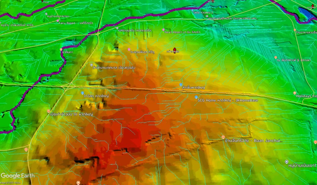 “ผลการคำนวณเมื่อนำไหลเป็นเส้นตรง อย่างที่ จ.สุโขทัย จะมีเส้นแบบนี้เป็นระยะ ๆ ทุกที่จะขุดเป็นแก้มลิงหมดเลย หมายความว่าเป็นพื้นที่ลุ่มต่ำ ซึ่ง อ.หาดใหญ่ พบหลายเวิ้งที่อยู่ระหว่างคลองอู่ตะเภา กับรางรถไฟ ซึ่งหากเป็นที่พักอาศัยจะอันตรายมาก”