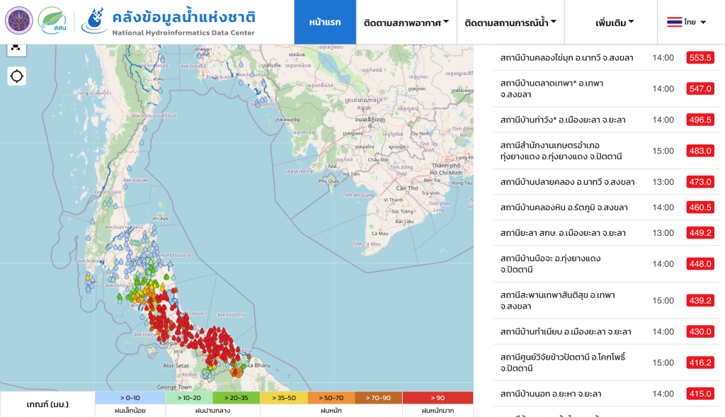 ศ.สันติ กล่าวว่า ภาพรวมสถานการณ์จะเห็นว่าในแผนที่ของ คลังข้อมูลน้ำแห่งชาติ รายงานว่า ในพื้นที่ จ.สงขลา รวมถึง 3 จังหวัดชายแดนใต้เป็นสีแดง หมายความว่า มีฝนตกหนักมาก และหนักเกิน 100 มิลลิเมตรทุกพื้นที่ ประกอบกับช่วงเดือน พ.ย. – ก.พ. เป็นช่วงที่น้ำทะเลหนุนสูง เพราะโลกอยู่ใกล้กับดวงอาทิตย์มากกว่าปกติ เป็นผลให้น้ำทะเลหนุนสูง โดยเฉพาะใน อ.หาดใหญ่ จ.สงขลา จากปัจจัยที่เกิดขึ้นข้างต้นเมื่อฝนตกทั่วถึงทุกพื้นที่ ทำให้น้ำไหลมารวมกันและมีร่องน้ำจากที่ราบไหลมารวมกันที่ตัวอำเภอจำนวนมาก