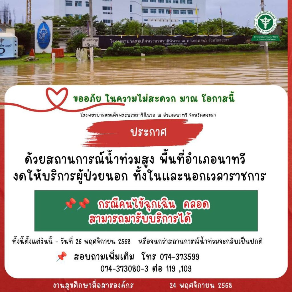 โดยเมื่อเวลา 16.25 น. ที่ผ่านมา เพจโรงพยาบาลสมเด็จพระบรมราชินีนาถ ณ อำเภอนาทวี จังหวัดสงขลา ได้โพสต์ ประกาศเนื่องด้วยสถานการณ์น้ำท่วมสูงพื้นที่อำเภอนาทวี ระบุ งดให้บริการผู้ป่วยนอกทั้งใน และนอกเวลาราชการ กรณีคนไข้ฉุกเฉิน คนไข้คลอด สามารถรับบริการได้ ทั้งนี้ตั้งแต่วันนี้ – วันที่ 26 พฤศจิกายน 2568 หรือจนกว่าสถานการณ์น้ำท่วมจะกลับเป็นปกติ สอบถามเพิ่มเติมโทร 074-373599 หรือ 074 – 373080-3 ต่อ 119 ,109