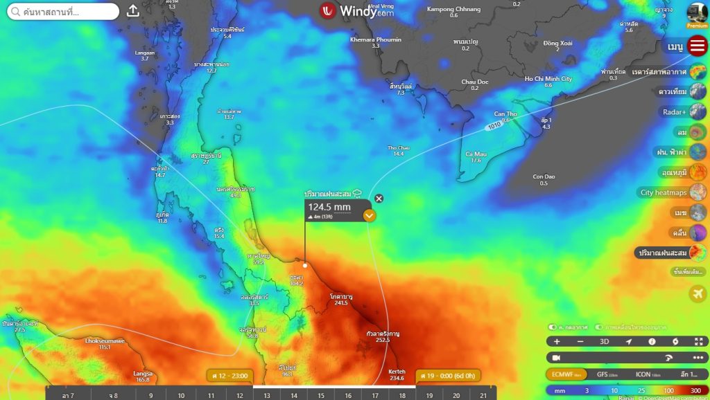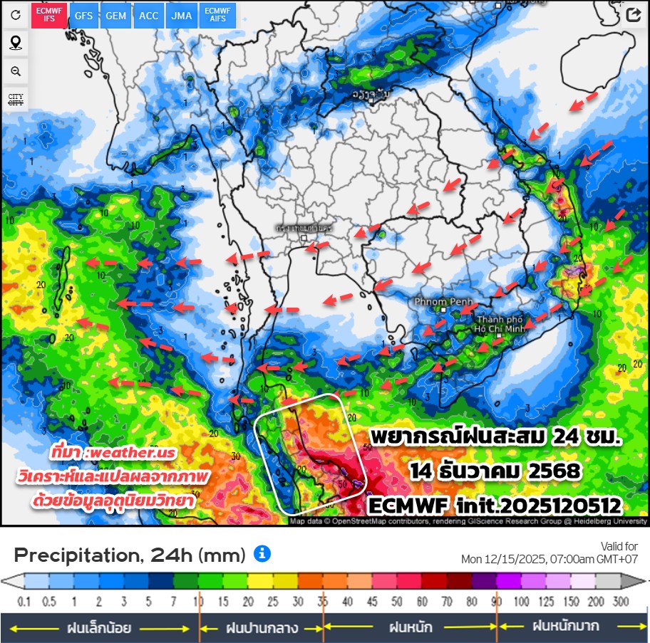 - ช่วงวันที่ 13-18 ธ.ค. 2568 เป็นช่วงที่มีฝนตกตั้งแต่ระดับปานกลางถึงหนักมากได้ในหลายพื้นที่ โดยเฉพาะพื้นที่ปัตตานี นราธิวาส ยะลา โดยเฉพาะจังหวัดนราธิวาสต้องระวังเป็นพิเศษ ในพื้นที่แม่น้ำสุไหงโกลก แม่น้ำบางนรา แม่น้ำสายบุรี ซึ่งก่อนนี้ยังได้รับฝนไม่เยอะมากโดยเฉพาะแม่น้ำสุไหงโกลก หากพิจารณาปริมาณคาดการณ์น้ำฝน จังหวัดนราธิวาสมีความเสี่ยงที่จะเกิดน้ำท่วม น้ำป่าไหลหลากได้ทั้งจังหวัด (ติดตามอย่างใกล้ชิด)