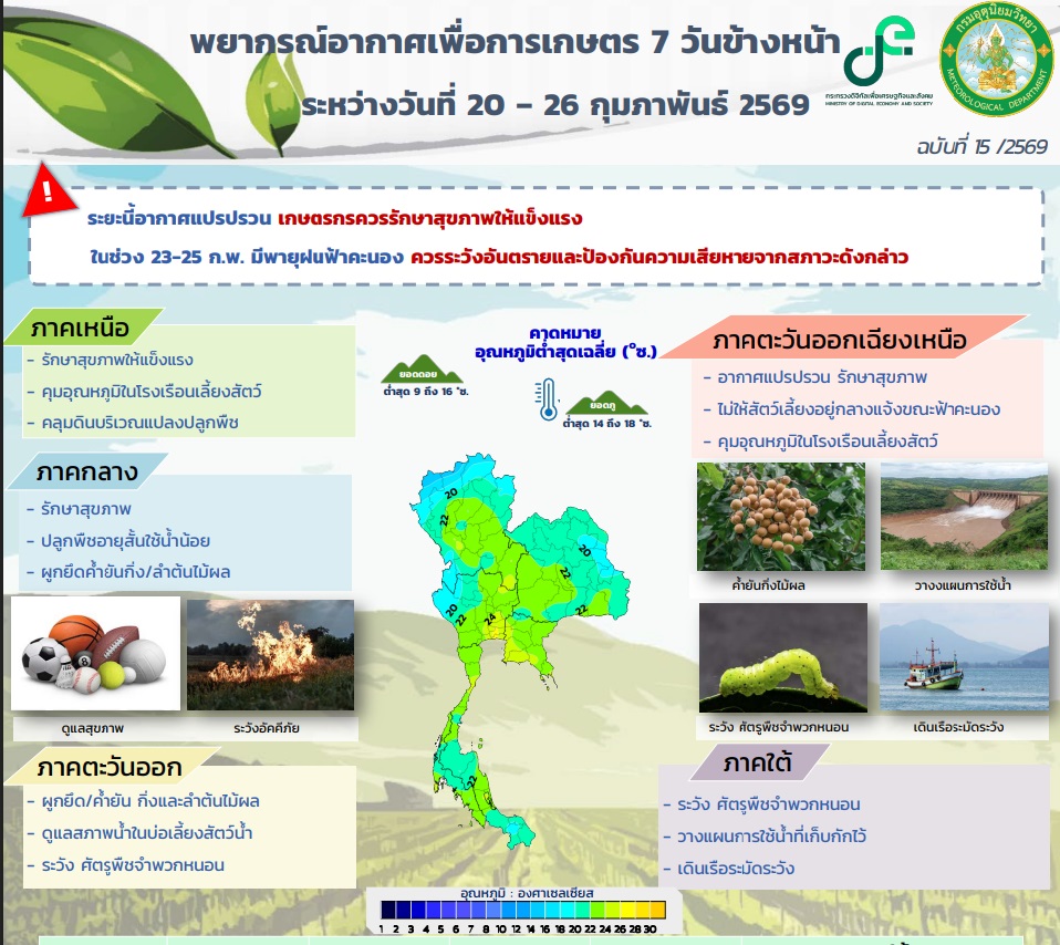 พืชสวนและผลไม้ มีผลอย่างมาก เพราะอากาศร้อนจัดทำให้น้ำระเหยเร็ว ควรหาฟางข้าวหรือใบไม้แห้งมาคลุมโคนต้นไม้เพื่อรักษาความชื้นในดิน สิ่งสำคัญที่สุดในช่วง 23-26 กุมภาพันธ์ 2569 คือต้อง “ผูกยึดและค้ำยันกิ่งไม้” ให้แน่นหนา เพื่อป้องกันลมกระโชกแรงพัดกิ่งหักหรือต้นโค่นล้ม