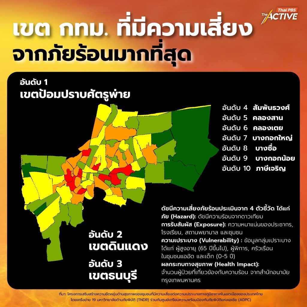 ข้อมูลจากโครงการเสริมสร้างความยืดหยุ่นด้านสุขภาพของชุมชนที่มีความเสี่ยงต่อความเปราะบางทางภูมิอากาศในเขตเมืองของประเทศไทย ดำเนินการโดยเครือข่าย 19 มหาวิทยาลัยด้านภัยพิบัติ (TNDR) ร่วมกับศูนย์เตรียมความพร้อมป้องกันภัยพิบัติแห่งเอเชีย (ADPC) พื้นที่เฝ้าระวัง สำหรับ 10 อันดับเขตในกรุงเทพมหานคร ที่ประเมินแล้วว่ามีความเสี่ยงจากภัยร้อนมากที่สุดอันดับ 1 ได้แก่ เขตป้อมปราบศัตรูพ่าย ตามมาด้วย อันดับ 2 เขตดินแดง และ อันดับ 3 เขตธนบุรีส่วนเขตอื่นๆ ที่ติดอันดับเฝ้าระวังได้แก่อันดับ 4 สัมพันธวงศ์อันดับ 5 คลองสานอันดับ 6 คลองเตยอันดับ 7บางกอกใหญ่อันดับ 8 บางซื่ออันดับ 9 บางกอกน้อย และอันดับ 10 ภาษีเจริญ