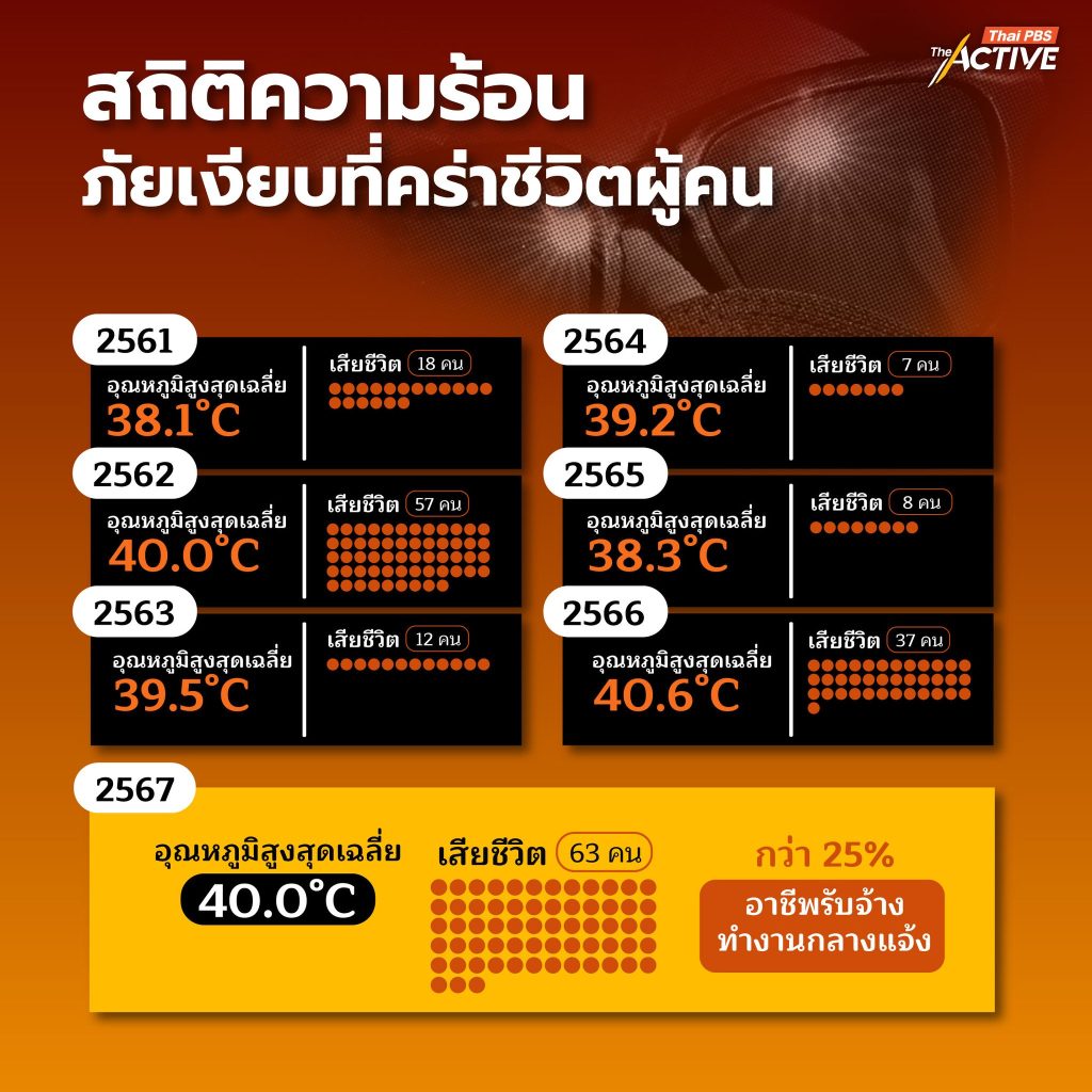 ปี 2567: อุณหภูมิเฉลี่ย 40.0 องศาเซลเซียส ผู้เสียชีวิตพุ่งสูงถึง 63 คน โดยกว่า 25% คือกลุ่มอาชีพรับจ้างที่ต้องทำงานกลางแจ้ง