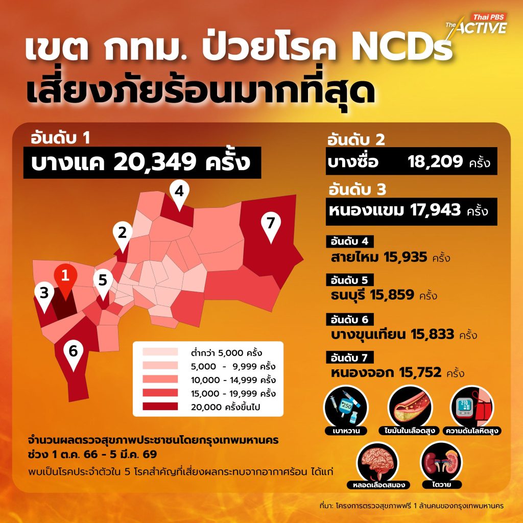 รายงานสรุปผลการดำเนินงานโครงการตรวจสุขภาพกรุงเทพมหานคร 1,000,000 คน ซึ่งมีผู้รับบริการรวมกว่า 912,738 ราย เผยให้เห็นข้อมูลเชิงลึกที่น่ากังวลว่า คนกรุงเทพฯ กำลังเผชิญกับวิกฤตพฤติกรรมสะสม ที่ทำให้ร่างกายเปราะบางต่อสภาพอากาศที่ร้อนจัดวิกฤตไม่ออกกำลังกาย: ประชากรถึง 41.62% ไม่ออกกำลังกายเลย โรคอ้วนและไขมัน อย่างกลุ่มผู้ที่มีน้ำหนักเกินเกณฑ์มีถึง 58.39% และผลตรวจระดับไขมันในเลือดพบความผิดปกติสูงถึง 58.74% โรคประจำตัว (NCDs) เพราะมีสถิติผู้ป่วยที่เกี่ยวข้องกับโรคความดันโลหิตสูง โรคเบาหวาน และไขมันในเลือดสูง กระจุกตัวอยู่ในหลายเขต โดย เขตบางแค มีผู้ป่วยโรค NCDs ที่เสี่ยงต่อภัยร้อนมากที่สุดถึง 20,349 ครั้ง รองลงมาคือ บางซื่อ และ หนองแขม