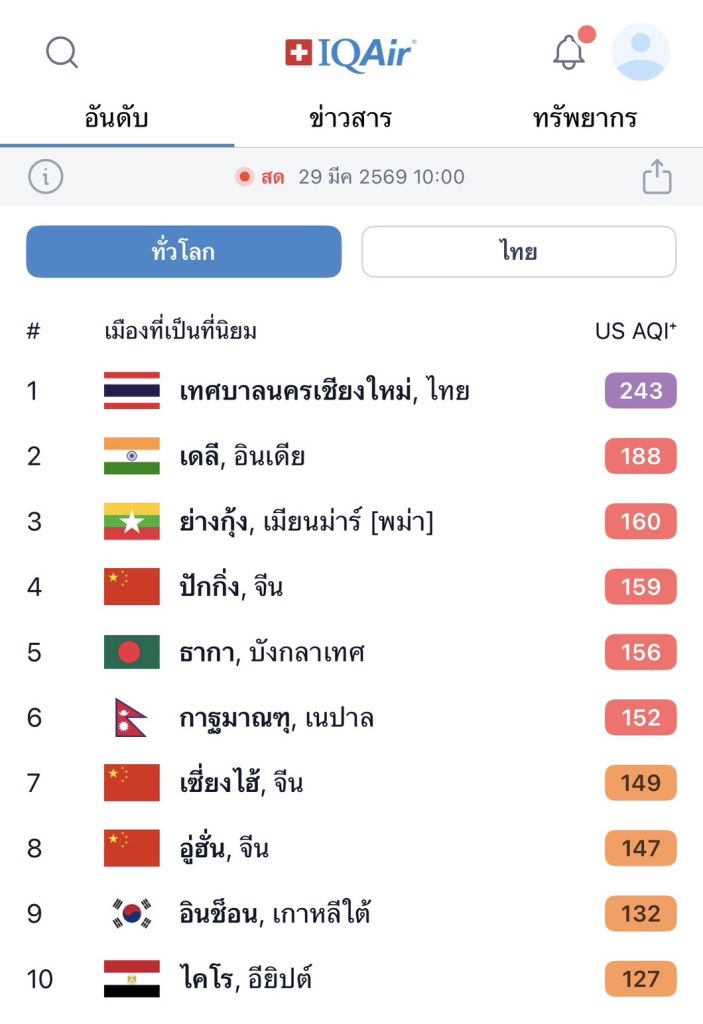 วันนี้ (29 มี.ค.2569) เว็บไซต์ IQAir จัดอันดับสด ณ ช่วงเวลา 09.00 – 10.00 น.เมืองใหญ่ที่มีมลพิษมากที่สุดในโลก พบ “เชียงใหม่ ประเทศไทย” ขึ้นอันดับ 1 ของโลก โดยค่า AQI อยู่ที่ระดับ 220 มีผลกระทบต่อทุกคนอย่างรุนแรง โดยเมืองใหญ่ที่มีค่ามลพิษสูงสุด 5 อันดับแรกของโลก ได้แก่