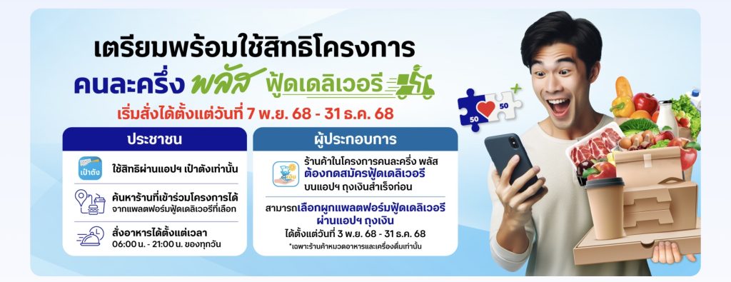 โดยสามารถซื้ออาหาร เครื่องดื่ม สินค้า และบริการที่กำหนดจากร้านค้าที่เข้าร่วมโครงการฯ สำหรับการซื้ออาหารหรือเครื่องดื่มผ่านผู้ให้บริการระบบขนส่งอาหาร (Food Delivery Platform) ที่ได้รับอนุมัติให้เข้าร่วมโครงการฯ ผ่านแอปพลิเคชัน “เป๋าตัง” สามารถใช้สิทธิได้ตั้งแต่ 7 พ.ย.-31 ธ.ค. 68 (เวลา 06.00 – 21.00 น.)