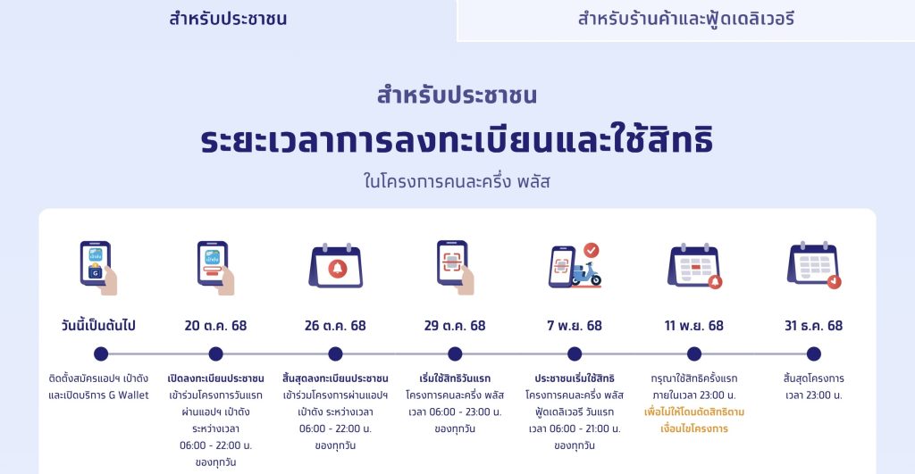 โดยจะเปิดรับลงทะเบียนประชาชนตั้งแต่ 20 ต.ค. – 26 ต.ค. 68 เวลา 06.00 – 22.00 น. จนกว่าจะครบจำนวนสิทธิ หรือครบวงเงินงบประมาณของโครงการ ซึ่งคนละครึ่งพลัส มีจำนวนสิทธิโดยประมาณ 20 ล้านสิทธิ หรือจนกว่าจะครบวงเงินงบประมาณ 44,000 ล้านบาท