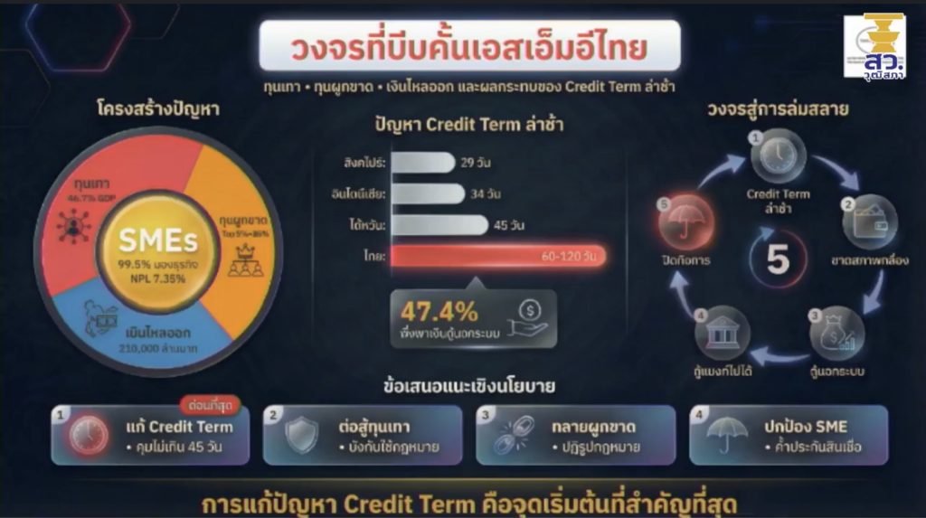 นอกจากนี้ เอสเอ็มอียังเผชิญปัญหาด้านเงื่อนไขการค้า โดยเฉพาะระยะเวลาการให้เครดิตเทอมที่ยาวนานถึง 60–120 วัน ซึ่งกระทบต่อสภาพคล่องอย่างรุนแรง หากสามารถปรับลดระยะเวลาลงมาเหลือไม่เกิน 45 วัน จะช่วยบรรเทาปัญหาสภาพคล่องของเอสเอ็มอีได้ ซึ่งปัจจุบันเอสเอ็มอีจำนวนมากต้องกู้เงินเพื่ออุ้มธุรกิจใหญ่ ส่งผลให้ต้องแบกรับต้นทุนดอกเบี้ย หากภาครัฐยังไม่เข้าไปกำกับดูแลเรื่องเครดิตเทอมที่ถือเป็นกระดุมเม็ดแรกของปัญหา ท้ายที่สุดเอสเอ็มอีจะวนกลับไปสู่ปัญหาไม่สามารถเข้าถึงแหล่งเงินกู้จากสถาบันการเงินได้อีกเหมือนเดิม