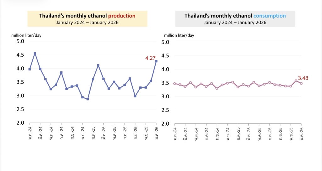 - การใช้เอทานอลเพิ่มขึ้นราว 2.6–3 ล้านลิตร/วัน