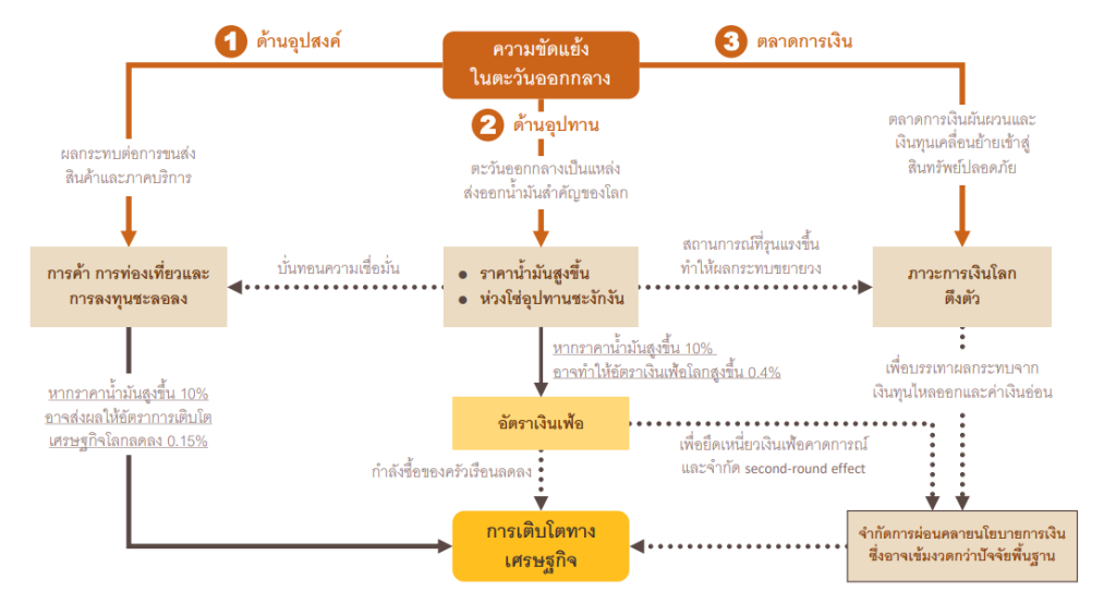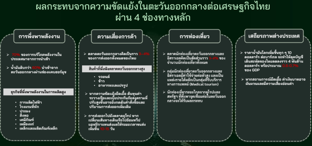 สำหรับประเทศไทย ผลกระทบจะขึ้นอยู่กับระดับความรุนแรงและระยะเวลาของความขัดแย้งในตะวันออกกลาง โดยช่องทางหลักมาจากต้นทุนพลังงาน ต้นทุนสินค้าและค่าขนส่งที่สูงขึ้น
