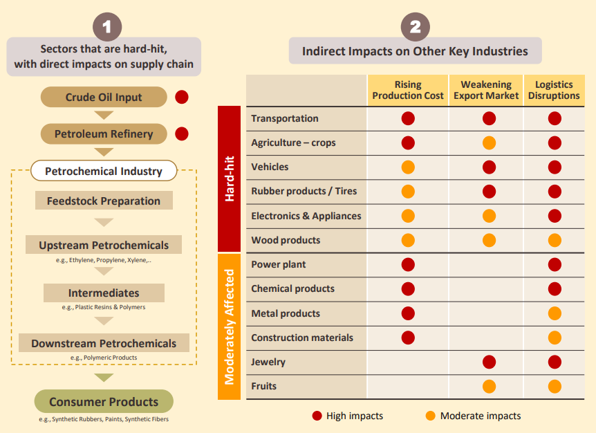 1. อุตสาหกรรมที่ได้รับผลกระทบทางตรง ได้แก่ อุตสาหกรรมโรงกลั่นน้ำมันและปิโตรเคมี รวมถึงธุรกิจโรงไฟฟ้าที่เผชิญกับการขาดแคลนวัตถุดิบ (Feedstock) รวมถึงอุตสาหกรรมที่พึ่งพาปัจจัยการผลิต (Input) จากตะวันออกกลางในสัดส่วนสูง โดยเฉพาะอุตสาหกรรมที่ใช้พลังงานเข้มข้น ภาคเกษตรกรรม วัสดุก่อสร้าง ตลอดจนอุตสาหกรรมที่พึ่งพาปิโตรเคมี อาทิ พลาสติก ซึ่งห่วงโซ่อุปทานที่หยุดชะงักอาจทำให้ต้นทุนการผลิตของอุตสาหกรรมเหล่านี้สูงขึ้น