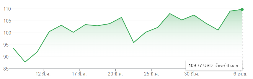 ด้านราคาน้ำมันโลกเปิดตลาดวันนี้ ยังคงปรับตัวขึ้นต่อเนื่องจากสัปดาห์ที่ผ่านมา โดยสัญญาซื้อขายล่วงหน้าน้ำมันเบรนท์ (Brent) ปรับขึ้น 0.78% อยู่ที่ 110.63 ดอลลาร์สหรัฐต่อบาร์เรล และสัญญาซื้อขายล่วงหน้าน้ำมันดิบเวสต์เท็กซัส (WTI) ปรับขึ้น 0.64% อยู่ที่ 113.13 ดอลลาร์สหรัฐต่อบาร์เรล