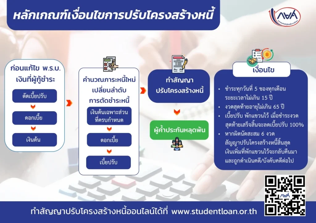 ทั้งนี้ ผู้กู้จะได้รับสิทธิระยะเวลาปลอดหนี้ นาน 2 ปี นับจากวันที่สำเร็จการศึกษา หรือพ้นสภาพการศึกษา และอาจขยายได้อีกไม่เกิน 2 ปีในกรณีจำเป็น นอกจากนี้ กยศ. ยังสามารถผ่อนผันเงื่อนไขการชำระหนี้ ปรับโครงสร้างหนี้ แปลงหนี้ใหม่ หรือระงับการชำระหนี้ได้ แม้อยู่ในระหว่างการดำเนินคดีหรือมีคำพิพากษาถึงที่สุดแล้ว เพื่อช่วยบรรเทาภาระของผู้กู้ยืม