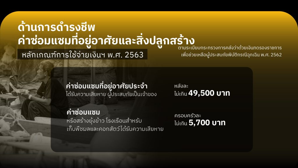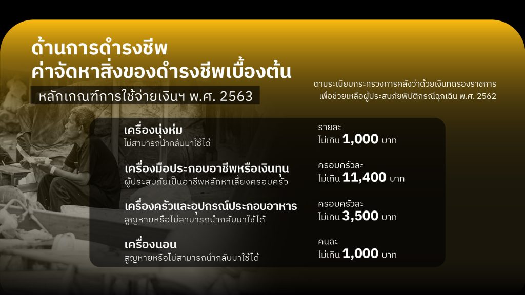 ไมตรี จงไกรจักร์ ผู้จัดการมูลนิธิชุมชนไท เปิดเผยกับ The Active เน้นย้ำถึงผู้ประสบภัยน้ำท่วมโปรดทราบว่า เงินเยียวยา 9,000 บาท เป็นการให้ความช่วยเหลือผ่านมติ ครม.เช่นเดียวกับค่าปลงศพ แต่ความจริงแล้ว ยังมีสิทธิ์ได้รับการชดเชยเยียวยาตาม “ระเบียบกระทรวงการคลังฯ 2562” ประกอบด้วย