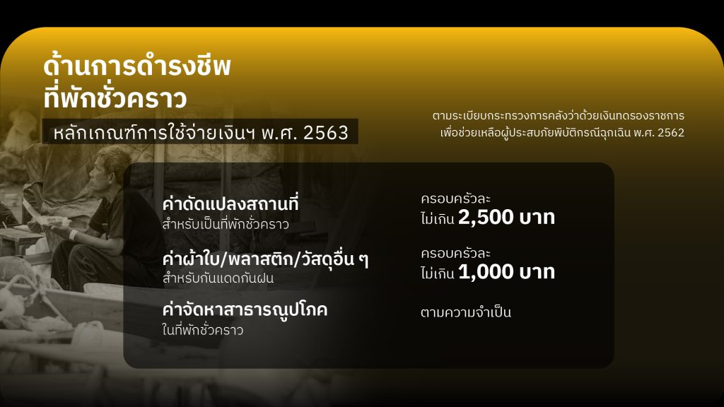 ย้ำ สิทธิ์ที่ประชาชน ผู้ประสบภัยต้องรู้!! นอกจากเงินเยียวยา 9,000 บาท ตามมติ ครม. ผู้ประสบภัยยังมีสิทธิ์ตามกฎหมาย ได้เงินชดเชยตามระเบียบกระทรวงการคลัง 2562 ชดเชยตามความเสียหายตามจริงอีกก้อน ทั้งชดเชยค่าครองชีพ เจ็บ ตาย บ้านเสียหาย พื้นที่เพาะปลูก สัตว์ตาย ก็ได้เงินอีกก้อน อย่าลืม!! ถ่ายรูปความเสียหายจากน้ำท่วม ไว้เป็นหลักฐาน ขณะที่ ภาคประชาชน จี้ รัฐ ท้องถิ่น เร่งสื่อสาร กระจายแบบฟอร์ม ให้ประชาชนเข้าถึงสิทธิ์ตามกฎหมายทันเวลา