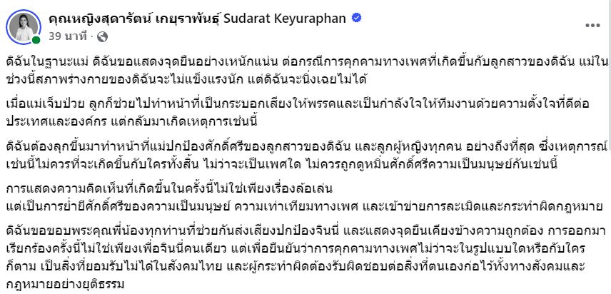 ล่าสุด คุณหญิงสุดารัตน์ เกยุราพันธุ์ โพสต์ระบุถึงจุดยืนในฐานะแม่ ต่อกรณีการคุกคามทางเพศที่เกิดขึ้นกับลูกสาว แม้ในช่วงนี้สภาพร่างกายจะไม่แข็งแรงนัก แต่จะนิ่งเฉยไม่ได้ พร้อมระบุว่า ในช่วงที่ตนเจ็บป่วย ลูกสาวก็ทำหน้าที่เป็นกระบอกเสียงให้พรรค และเป็นกำลังใจให้ทีมงานด้วยความตั้งใจที่ดีต่อประเทศและองค์กร แต่กลับมาเกิดเหตุการณ์เช่นนี้