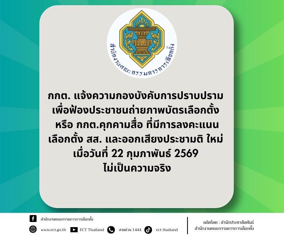 เมื่อวันที่ 27 ก.พ.69 สำนักงานคณะกรรมการการเลือกตั้งออกเอกสารชี้แจงปฎิเสธ ข่าว กกต.แจ้งความฟ้องประชาชนถ่ายภาพบัตรเลือกตั้ง หรือคุกคามสื่อ ระบุ ไม่เป็นความจริง พร้อมให้เหตุผลว่า บุคคลหรือสื่อมวลชนที่ดำเนินการตั้งกล้องวีดิโอหรือถ่ายรูปบัตรเลือกตั้ง ที่กรรมการประจำหน่วยเลือกตั้งดำเนินการขานคะแนนหรือนับคะแนน หรือถ่ายภาพบรรยากาศของประชาชนมาใช้สิทธิ สามารถทำได้และไม่มีความผิดตามกฎหมาย
