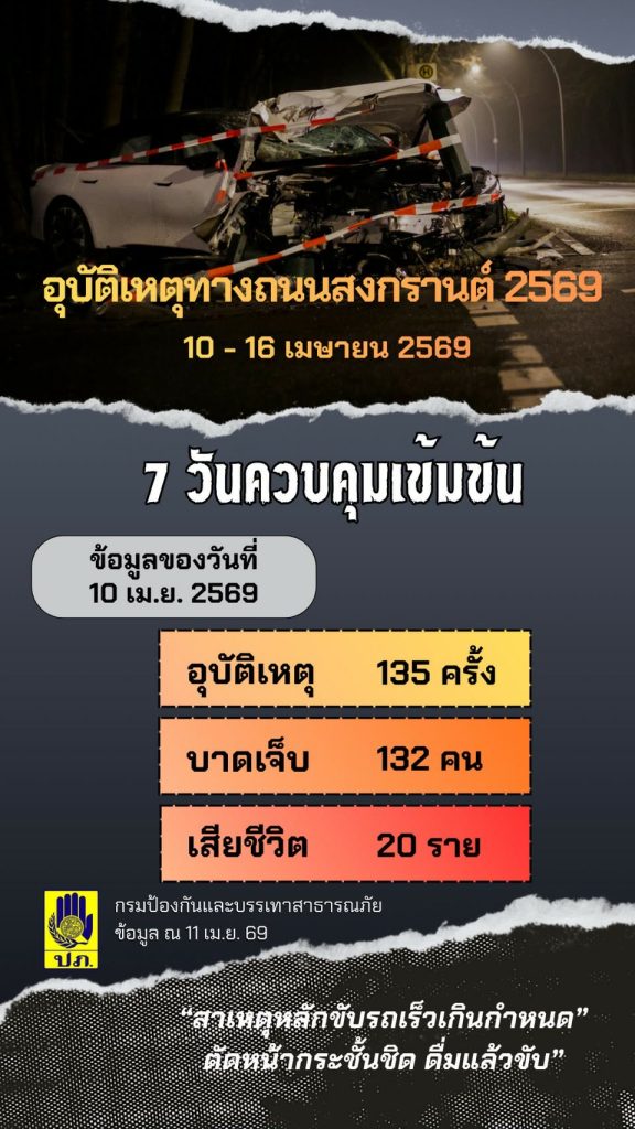 วันนี้ (11 เมษายน 2569) เปิดสถิติ 7 วันอันตรายสงกรานต์ 2569 วันแรก(10 เมษายน 2569)เกิดอุบัติเหตุ 135 ครั้ง เสียชีวิตแล้ว 20 คน