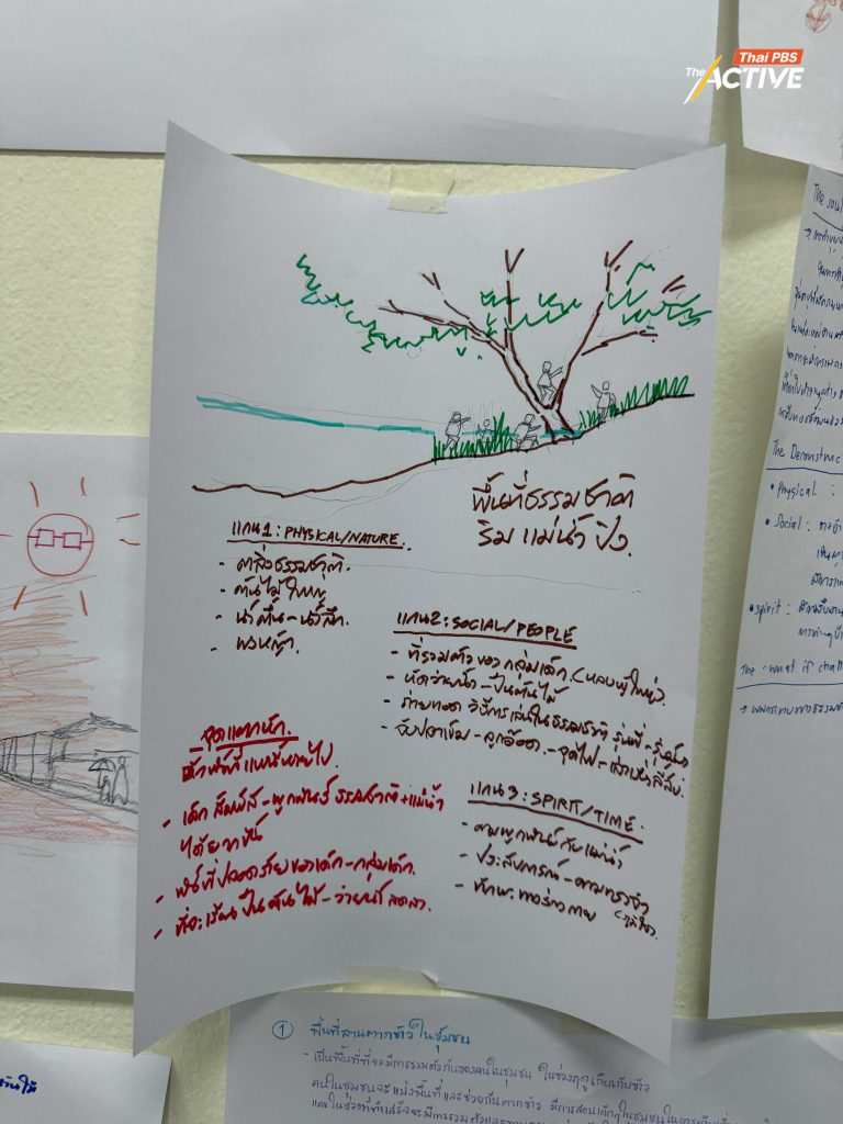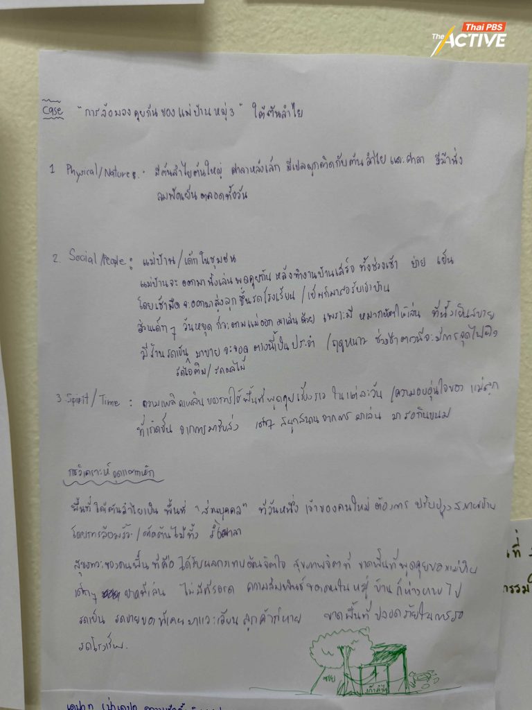 ในกระบวนการเวิร์กช็อปที่จัดขึ้น ผศ.วรงค์ ได้ชวนผู้เข้าร่วมฝึกมองพื้นที่ผ่าน “สามแกนสำคัญ” ได้แก่ สถานที่ ผู้คน และวัฒนธรรม เพื่อทำความเข้าใจความสัมพันธ์ที่ซ่อนอยู่ในพื้นที่ก่อนจะลงมือออกแบบ เพราะสิ่งต่าง ๆ ที่เราเห็นว่ามันอยู่มาได้ยาวนาน มันไม่ได้มีแค่โครงสร้างหรือฮาร์ดแวร์ แต่มันมีซอฟต์แวร์ที่คอยจัดการอยู่ด้วย “ซอฟต์แวร์” ในที่นี้หมายถึงวิถีชีวิต ความสัมพันธ์ และบทบาทของผู้คนที่ทำให้พื้นที่มีความหมาย