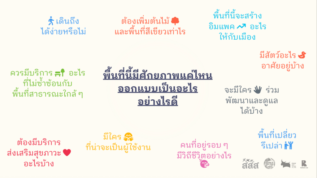 “ทำให้ผู้เข้าร่วมต้องคิดหาวิธีพัฒนาพื้นที่สาธารณะให้ตอบโจทย์หลายมิติ ทั้งมิติด้านสุขภาพกาย การสร้างพื้นที่กิจกรรมที่เหมาะสมกับคนทุกกลุ่มวัย มิติด้านจิตใจและสังคม ที่ทำให้ผู้คนมีพื้นที่พบปะ พูดคุย และทำกิจกรรมร่วมกัน รวมถึงมิติทางเศรษฐกิจ ที่ช่วยสร้างรายได้และทำให้พื้นที่สามารถดำรงอยู่ได้อย่างยั่งยืน”