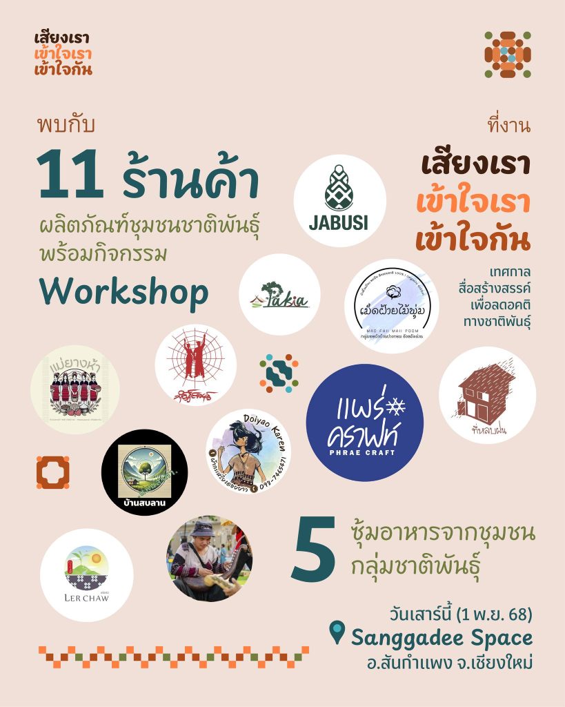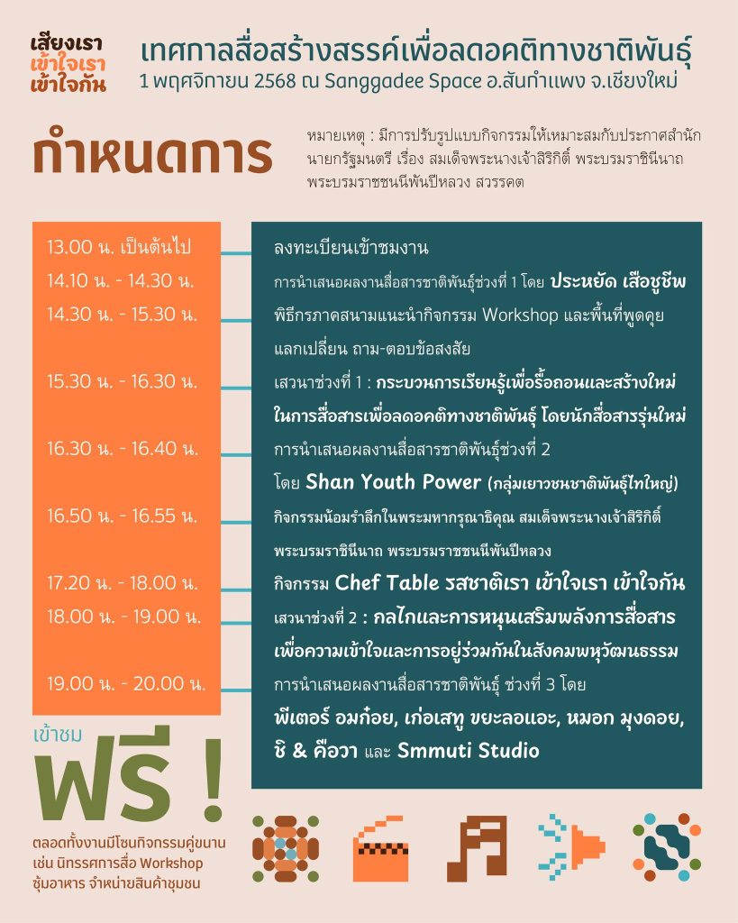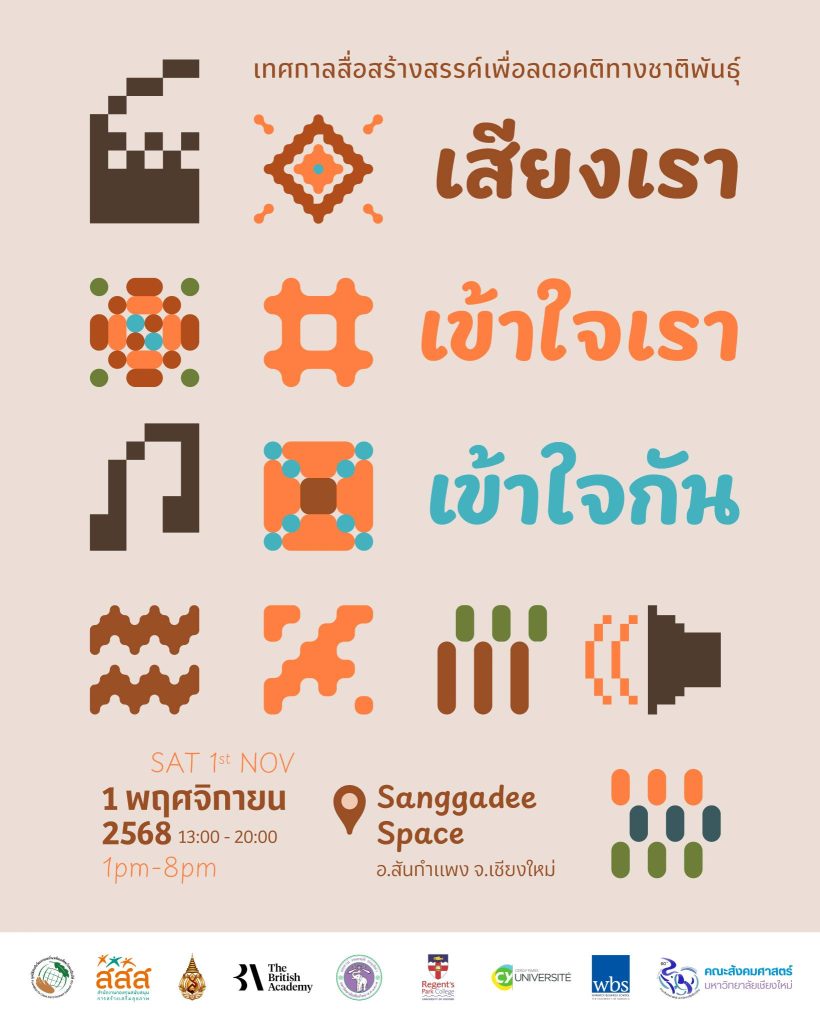 นั่นเป็นที่มาของการชวนผู้คนในสังคมมาเรียนรู้ และรื้อถอนอคติร่วมกัน ผ่านกิจกรรม “เสียงเรา เข้าใจเรา เข้าใจกัน” : เทศกาลสื่อเพื่อลดอคติทางชาติพันธุ์ ที่มีทั้งนิทรรศการ Showcase ผลงานจากนักสื่อสาร เวทีเสวนา พื้นที่แลกเปลี่ยนพูดคุย ศิลปะการแสดง กิจกรรม Workshop และบูธจำหน่ายอาหาร สินค้าและผลิตภัณฑ์จากกลุ่มชาติพันธุ์ ในวันเสาร์ที่ 1 พฤศจิกายน 2568 ตั้งแต่เวลา 13.00 – 20.00 น. ณ สังกะดีสเปซ อ.สันกำแพง จ.เชียงใหม่