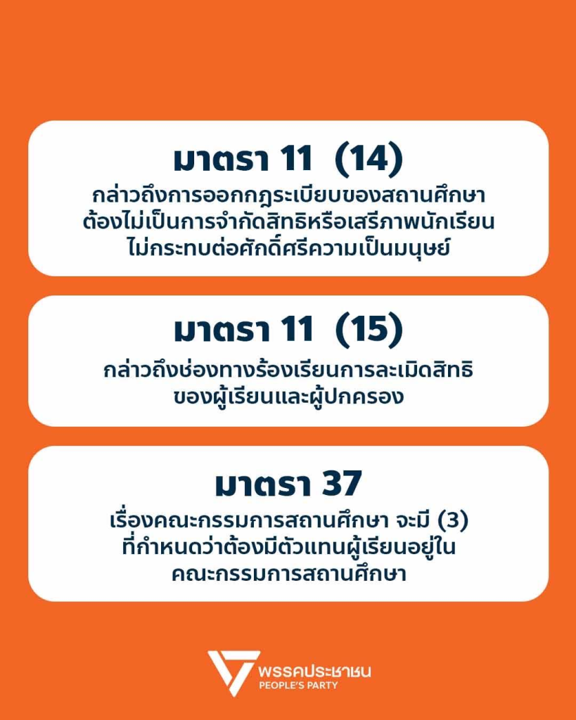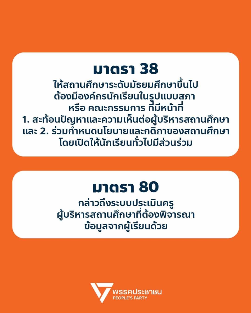 ขณะเดียวกัน พรรคยังยืนยันการผลักดันบทบาทเยาวชนผ่านนโยบายปฏิรูปสภาเด็กและเยาวชนให้มาจากการเลือกตั้ง และเพิ่มอำนาจในการมีส่วนร่วมเชิงนโยบาย โดยย้ำว่าพรรคประชาชนยังคงยึดหลักการปฏิรูปการศึกษาอย่างรอบด้าน เปิดพื้นที่ให้ทุกคนมีส่วนร่วม และยืนยันว่าหัวใจของการศึกษาคือผู้เรียน