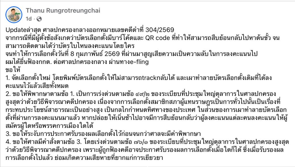 ธนู รุ่งโรจน์เรืองฉาย หรือ ทนายชา โพสต์เฟซบุ๊กระบุว่า ขณะนี้ศาลปกครองกลางได้ออกหมายเลขคดีดำที่ 304/2569 รับคำร้องของเขาจากกรณีพบ บาร์โค้ดบนบัตรเลือกตั้งแล้ว โดยเนื้อหาโพสต์ระบุว่า